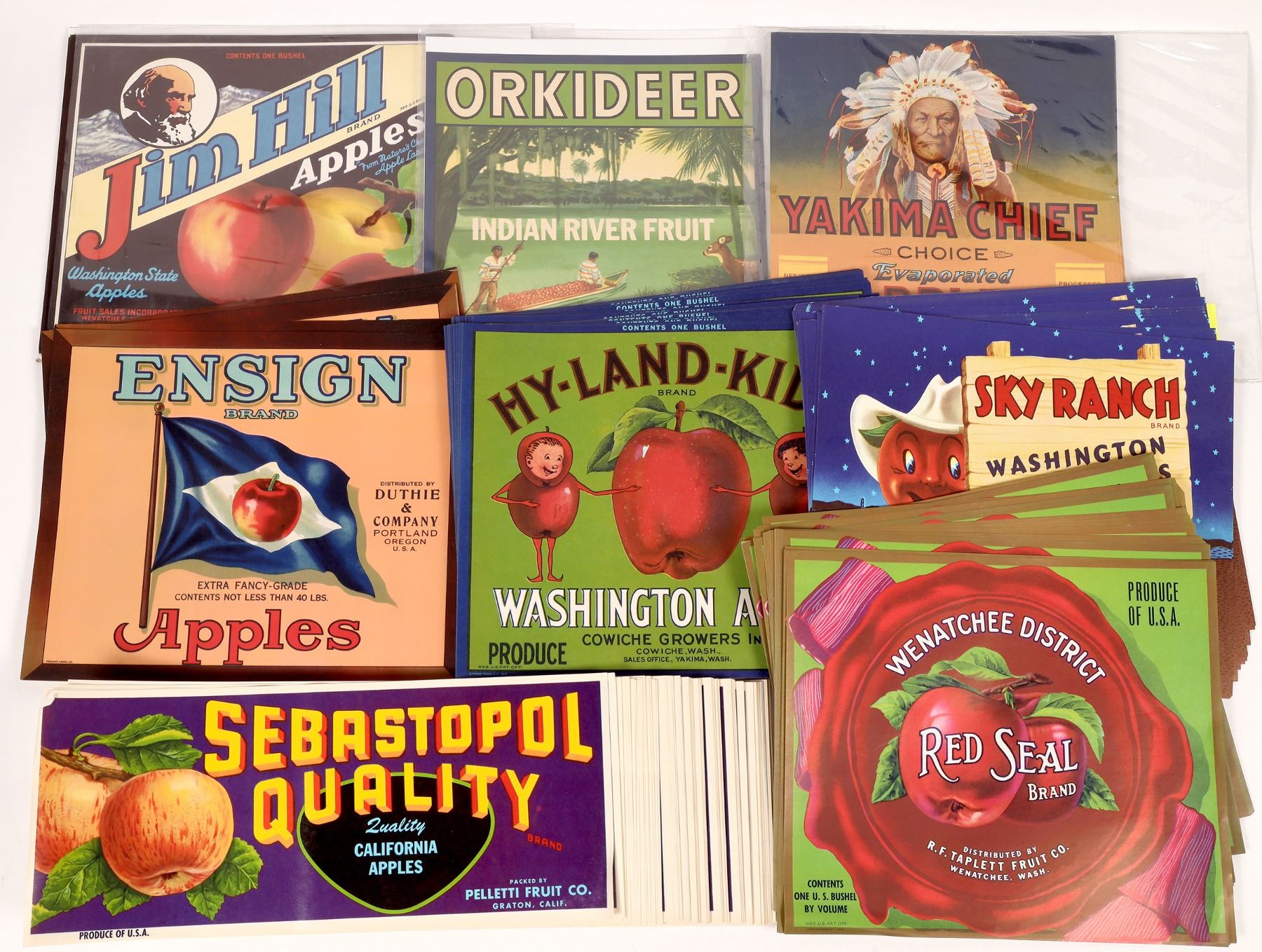 About 400 apple crate labels. Ensign, Sebastopol Quality, Hy-Land-Kids, Sky Ranch, Red Seal, Yakima Chief and more. 8.5x10.5" and 5.5x13".