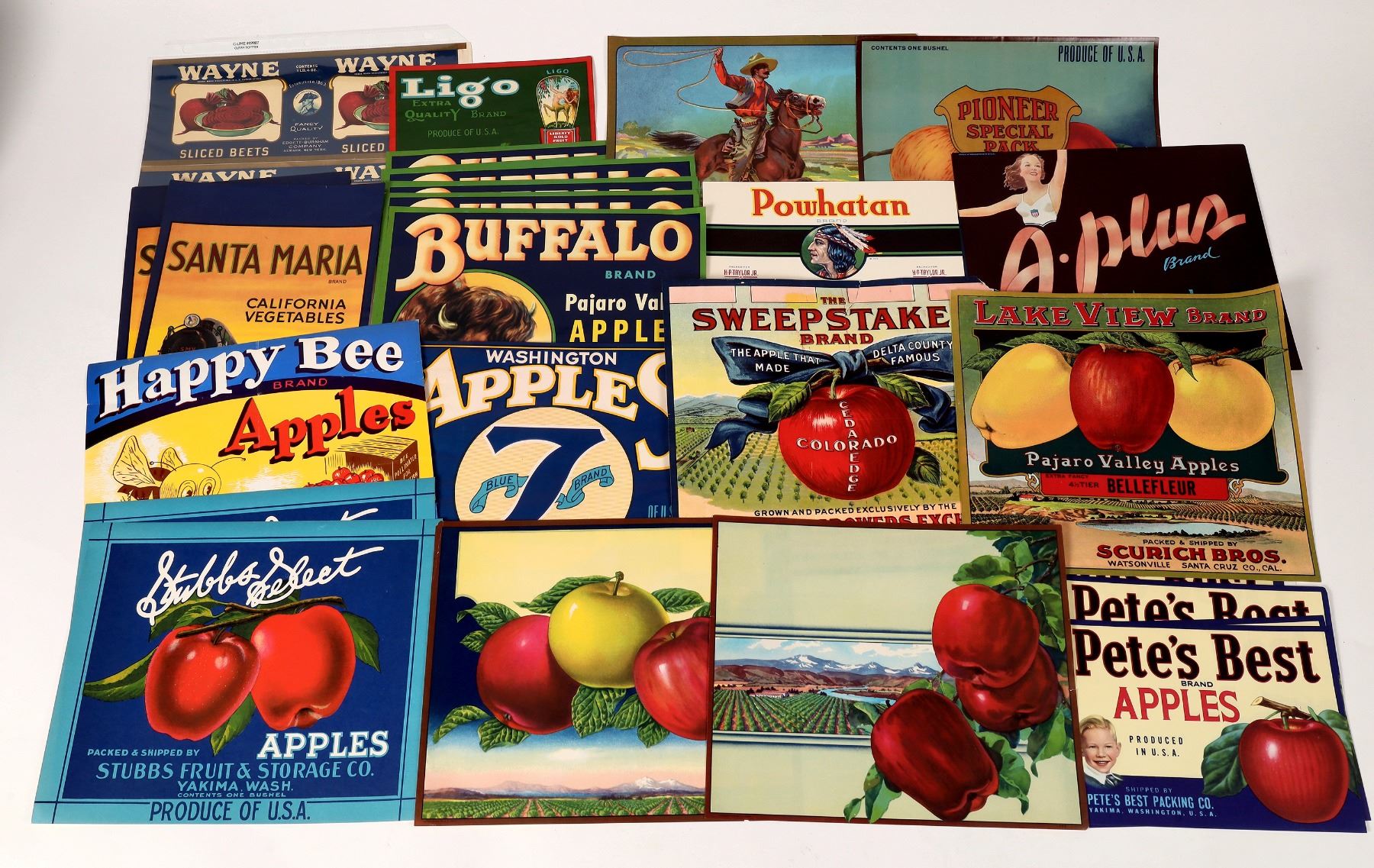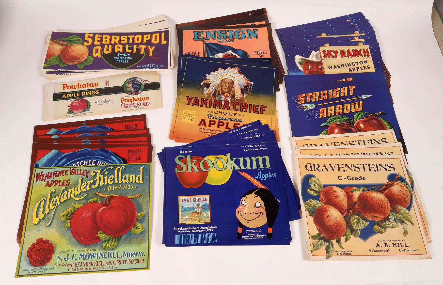 About 400 apple crate labels, 8.75x10.5" and 5.5x13". Sebastopol Quality, Ensign, Sky Ranch, Blue Seal and more.