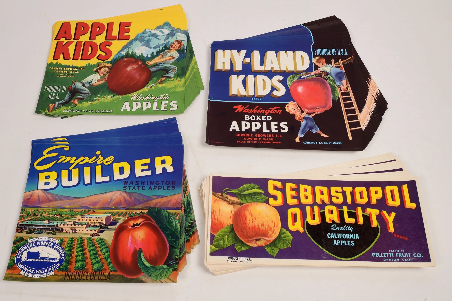 About 450 apple fruit crate labels from Washington and California, 4 different, 5.5x13" and 9x10.5". Sebastopol Quality, Hy-Land Kids, Empire Builder, Apple Kids.