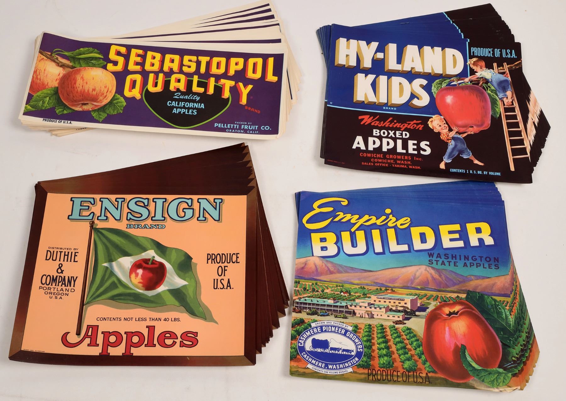 About 450 apple fruit crate labels from California and Washington, 4 different. Sebastopol Quality, Hy-Land Kids, Ensign, Empire Builder. 5.75x13.25" and 9x10.5".