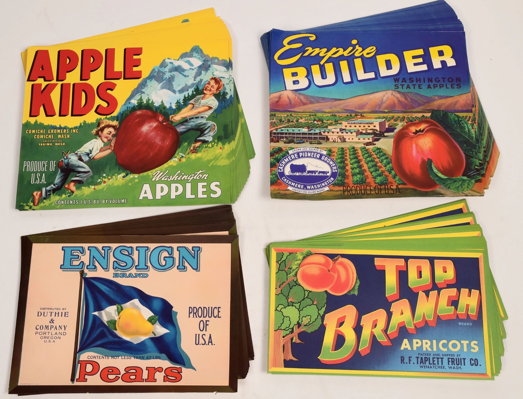 About 400 labels from Washington and Oregon. 9x10.5". Apple Kids, Ensign Pears, Top Ranch Apricots, Empire Builder Apples.
