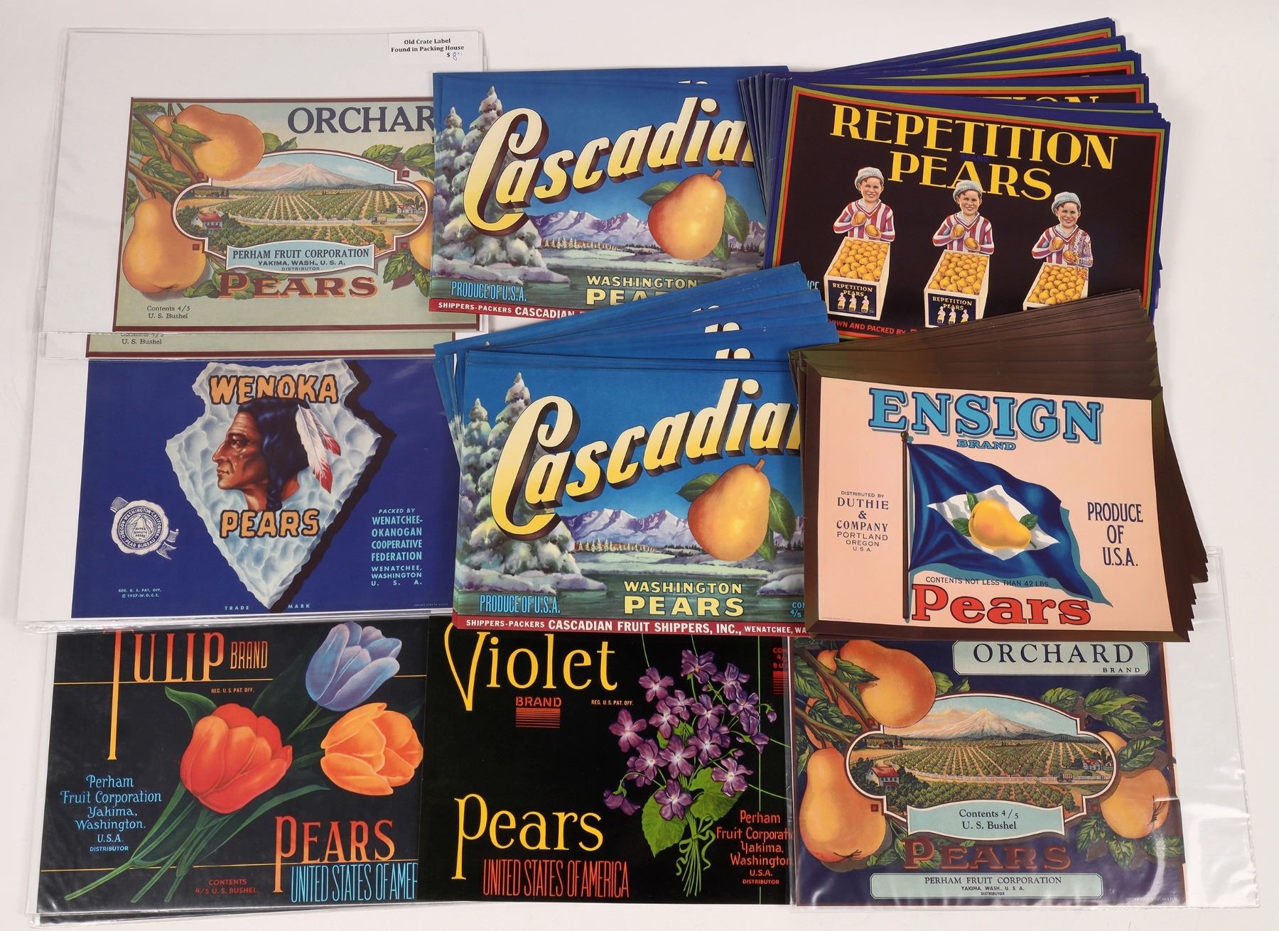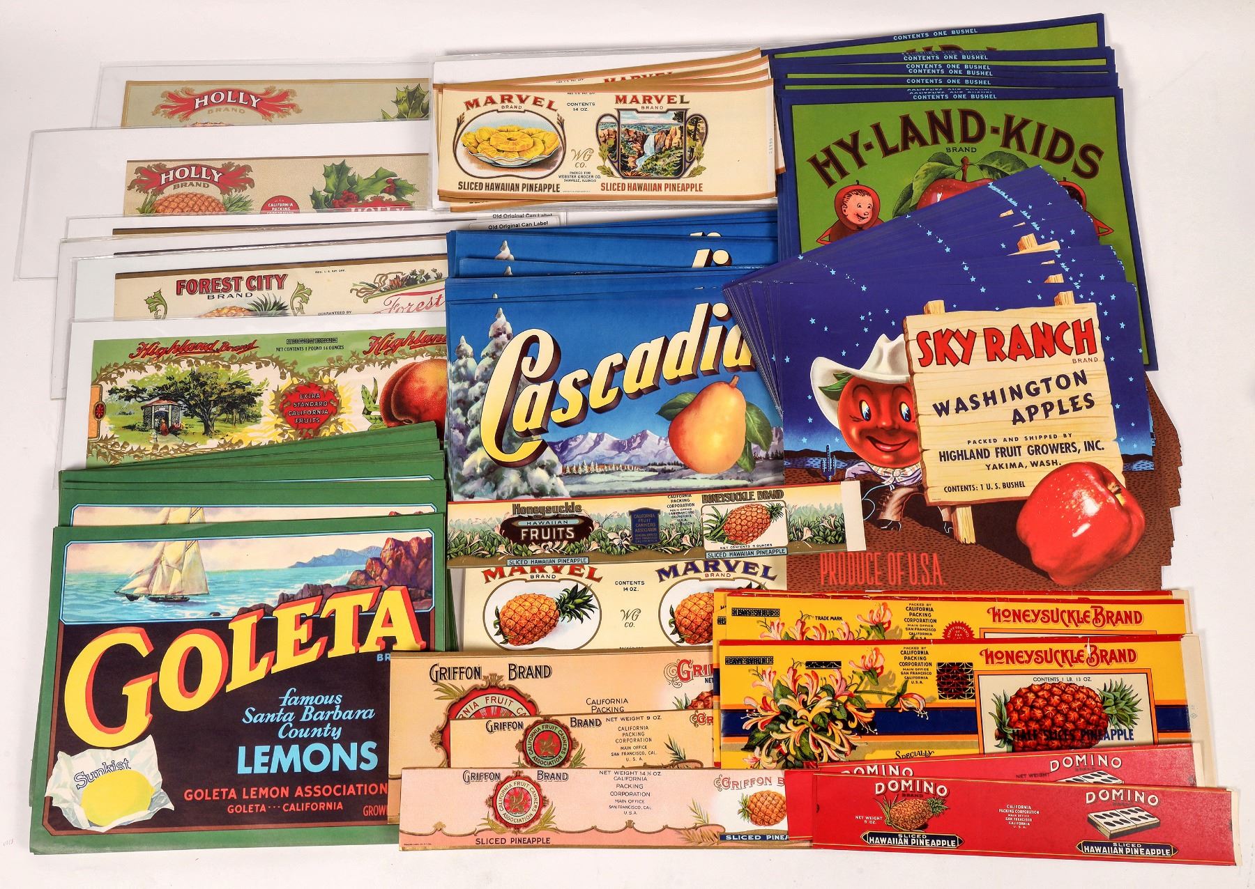 About 400 apple, pineapple, pear and lemon labels. 9x10.5" and 4.5x13.5".