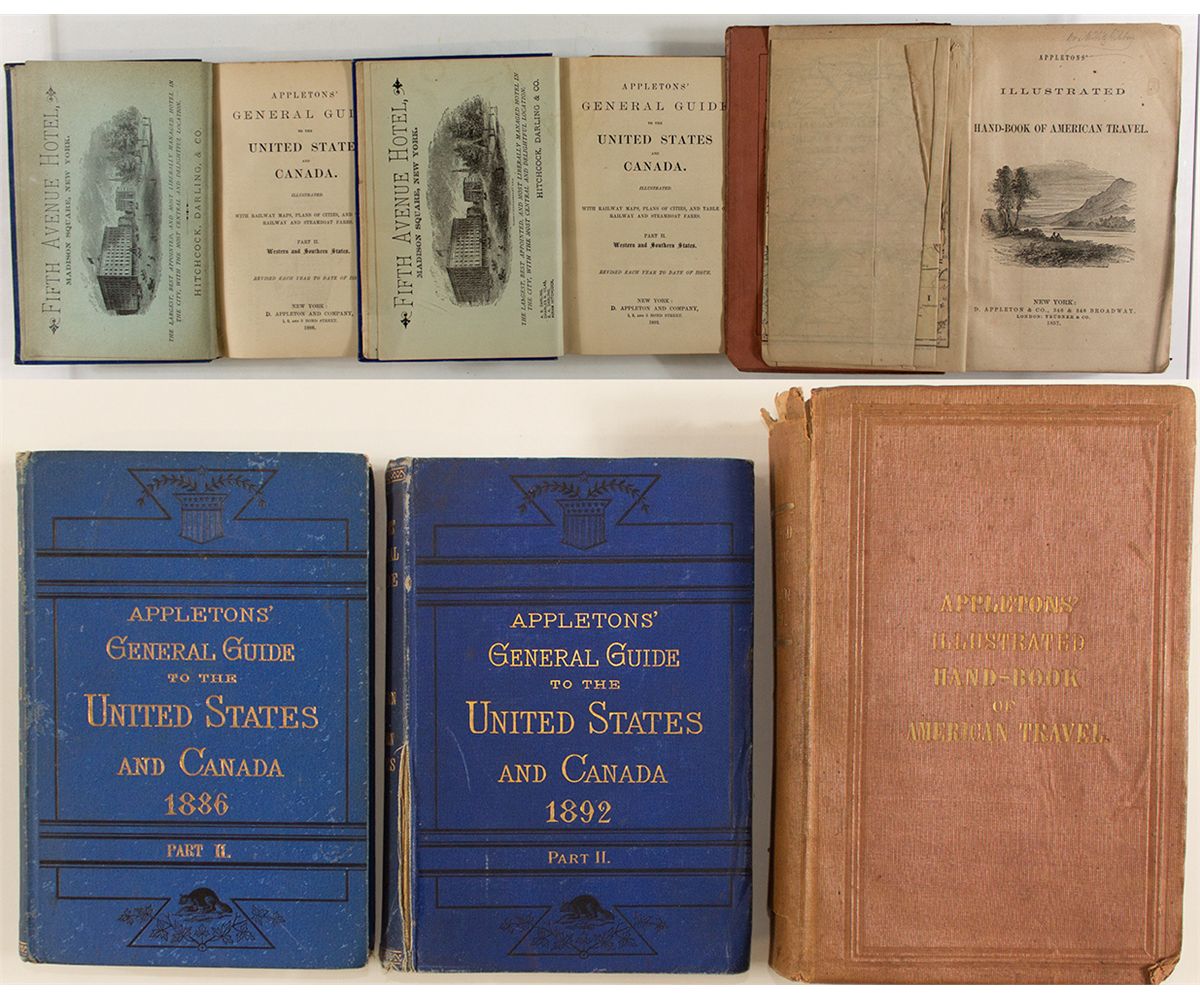 Set of three. 1) Appleton's’ Illustrated Hand-book of American Travel, 1857. “a full and reliable guide by railway, steamboat, and stage, to the cities towns, waterfalls, battle-fields, mountains, rivers, lakes, hunting and fishing grounds, watering places, summer resorts, and all scenes and objects of importance and interest in the United States and the British Provinces.“ By T. Addison Richards. 2) General Guide to the United States and Canada, 1886, Part II, Western and Southern States. “with railway maps, plans of cities and table of railway and steamboat fares. 3) Same as (1), but 1892. Books in various conditions. 1857 book: spine cover detaching, three maps with 2-3” tears, overall in good condition. 417+24 pages. 1886 book in very good condition; one map has a 2” tears. 546 + advertising pages. 1892 book: inside in excellent condition, San Francisco map has large tear that needs to be repaired. 596 + 12 + advertising pages. [Overall rarity: iv]City: County: State: Date: 1857, 1886, 1892