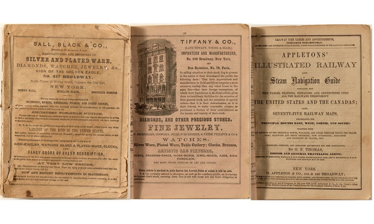 Appletons Illustrated Railway and Steam Navigation Guide, published by D. Appleton & Co., 346 & 348 Broadway, New York, 1859. Includes table of contents (P. 26), in addition to “Time Tables, Stations, Distances, and Connections upon all the Railways throughout the U.S. and the Canadas; also, Seventy-Five Railway Maps. Soft cover, 275 pages, with many advertisements.