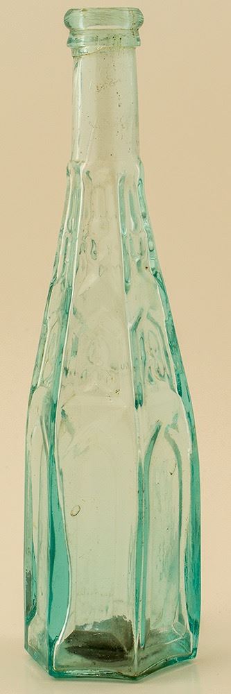 Aqua cathedral pepper sauce. Pepper sauces were an important staple in the 19th century American diet, enjoyed for their distinctive flavor and for their ability to mask unpleasant tastes. Embossed, six sided, Iron pontil. 9" tall, 2" wide. A very nice example. City: State: Date: c. 1880's Inventory# 40966