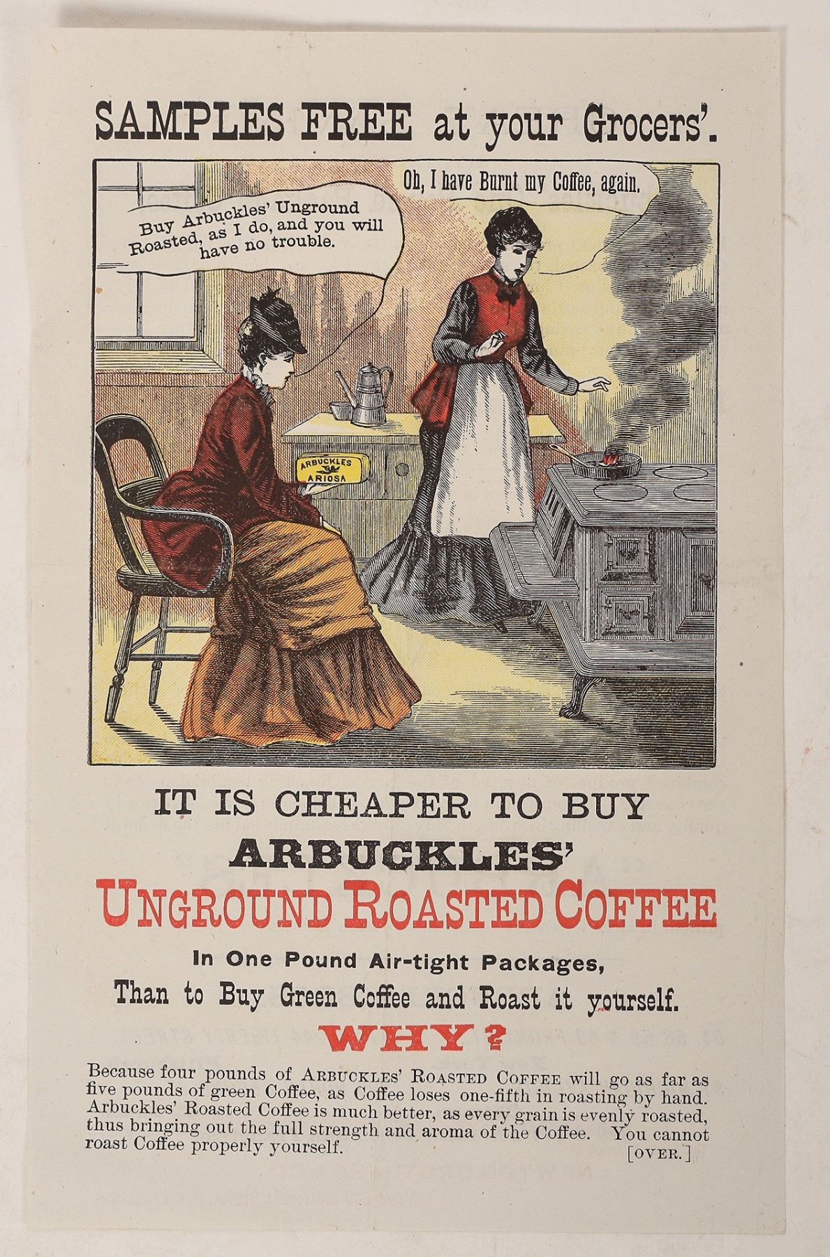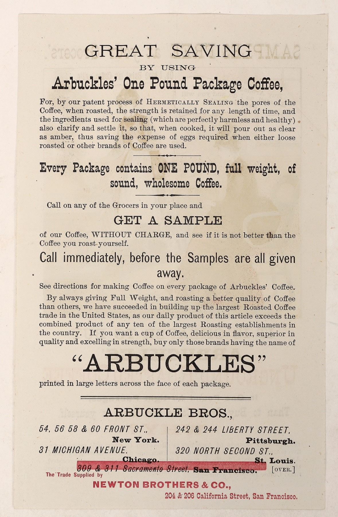 1885 Arbuckle's Coffee color 2 sided broadside. 9.5x6". [