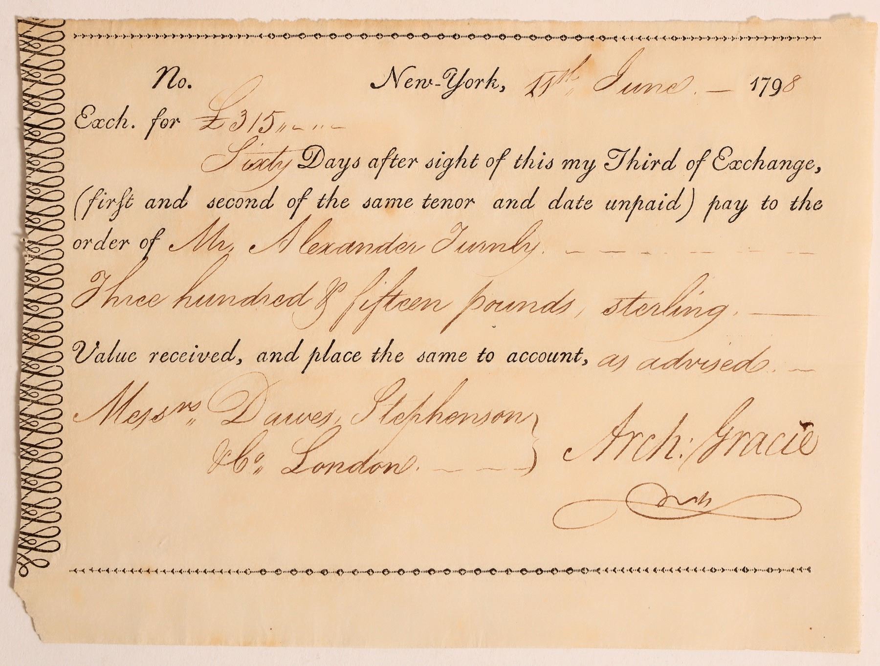 This draft note is signed by businessman, and shipping magnate Archibald Gracie (1755-1829). Printed format with a clear signature dated 1798. 5 in. X 7 in. Please see photo for details. Gracie built the Gracie mansion, which is the residence of the New York governor. His great-grandson was onboard the Titanic and survived by climbing aboard an overturned collapsible lifeboat.