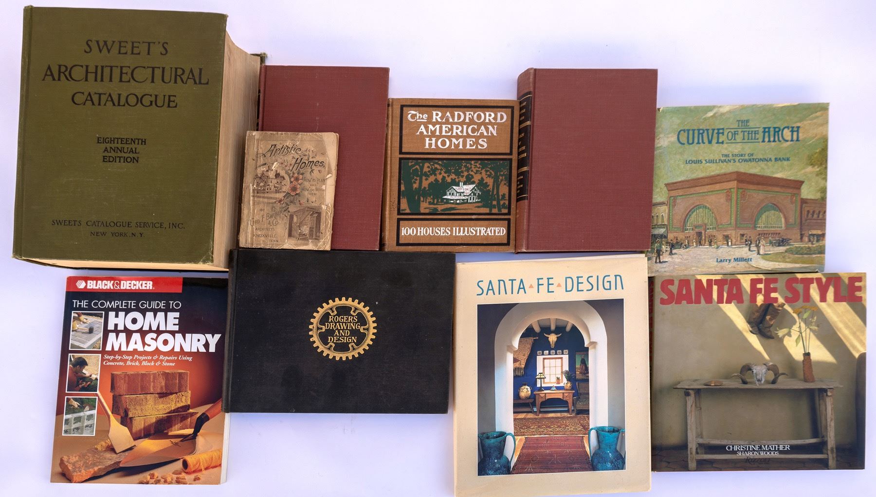 Artistic Homes by Barber 1893, Santa Fe Design by Baca, The Curve of the Arch by Millett, Santa Fe Style by Mather, Sweet's Architectural Catalogue-18 annual edition, massive 2405pp catalog of building materials and supplies with illustrations. Design of Concrete Structures by Urquhart, The Radford American Homes with attractive binding, Black and Decker Complete Guide to Home Masonry. Construction, Planning, Equipment and Methods by Peurifoy, Rogers Drawing and Design 1903. State: City: Date: Provenance: Stuart Mackenzie Montana Ephemera Collection