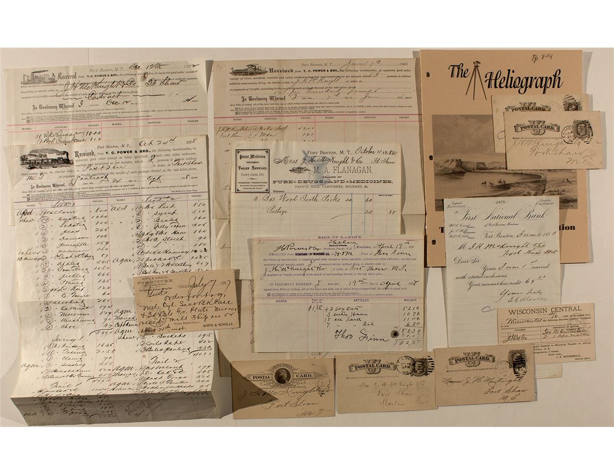 Fort Shaw established in 1867 on the Sun River. Fort Benton established in 1846 on the Missouri River was 70 miles east of Fort Shaw and considered the birthplace on Montana. Both Forts are covered in a Heliograph magazine article by Sam Dougan in 1998. There are several shipping receipts, a telegram, a billhead and medicine receipt included in this lot.