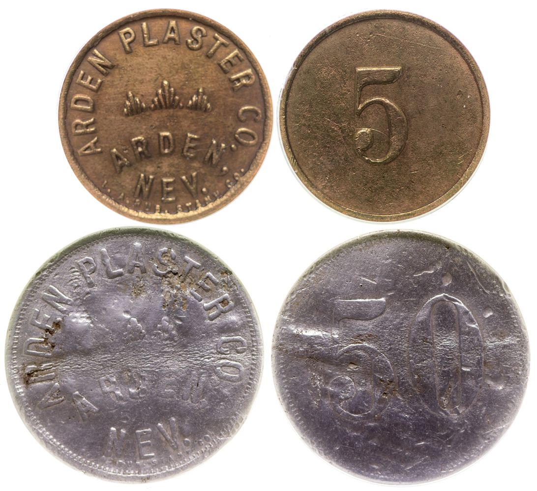 Lot of 2: 1) Obv.: Arden Plaster Co. / Arden / Nev. / L.A. Rub. Stamp Co..; rev.: 50; Al, 30mm, NCS genuine; 2) Obv.: Arden Plaster Co. / Arden, / Nev.; rev.: 5; Br.,21mm, NCS genuine.