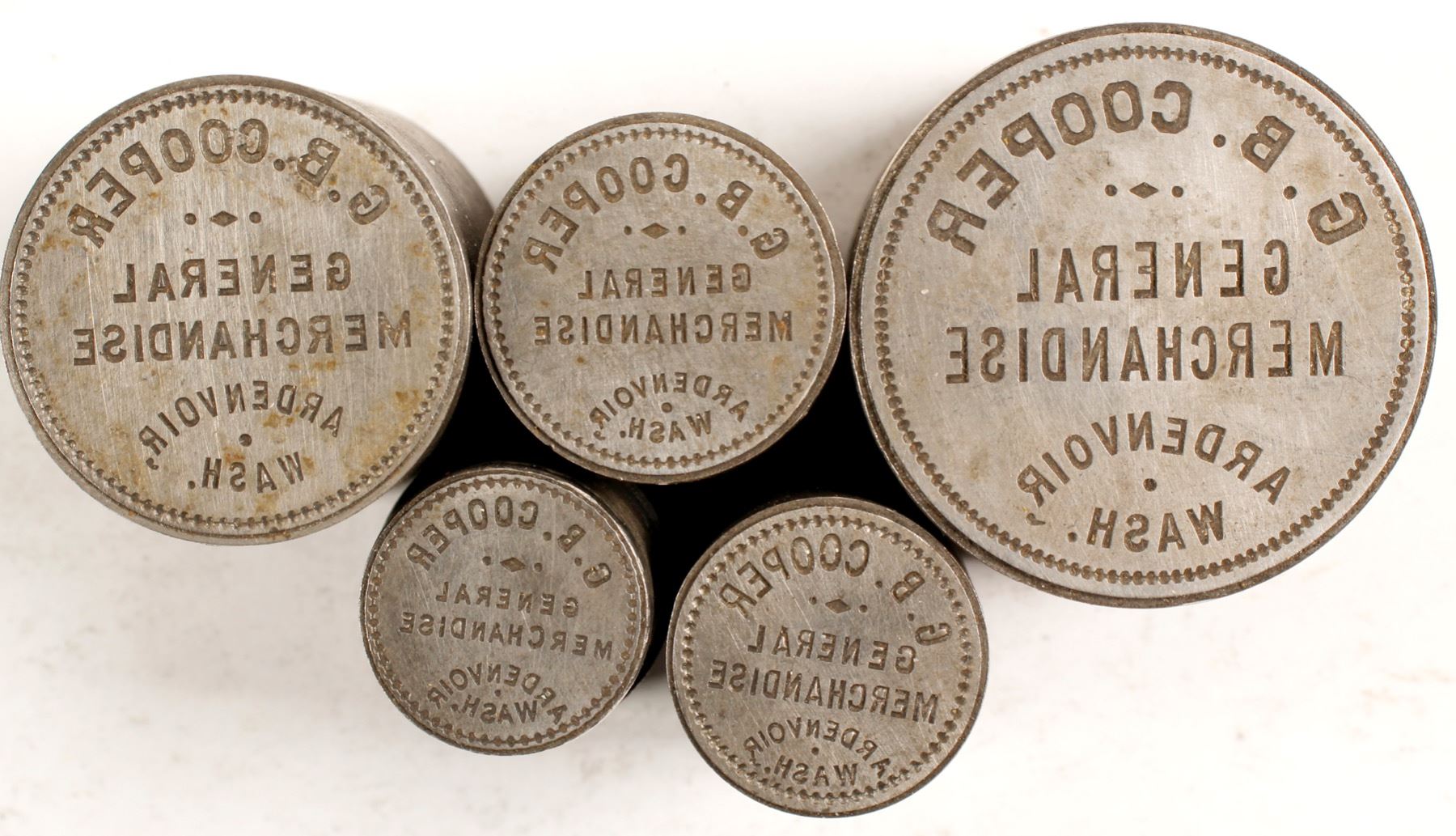 5 tokens self identified from Ardenvoir WA, 1 each from GB Cooper: 13mm, 19mm, 22mm, 32mm, 36mm. Northwest Territorial Mint Historical Die Collection. State: Washington City: Ardenvoir Date: c1903-1950 HWAC# 85603