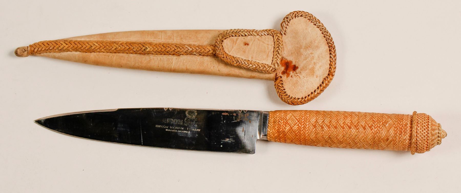 IF you collect knives you probably don't have this one. This beautifully crafted sheath knife is marked "Airon" with a feather logo "Entwurf Soligen Germany Industia Argentina" and is 10 1/2 in. (26.5 cm) overall length with a 6 in. (15 cm) blade. The blade is a highly polished drop point with several file markings at the top of the blade for pressure points. The grip is the best part with a hand wrapped very fine leather that is either five strand or four strand weave for a grip. The craftsmanship is spectacular in its execution with the pommel finished in a button cap. This knife is thought to have been made in the 1950's-1970's and is as new condition. There is a matching sheath of light colored leather with the same fine stitch weave lacing. Date: Location: HWAC# 40734