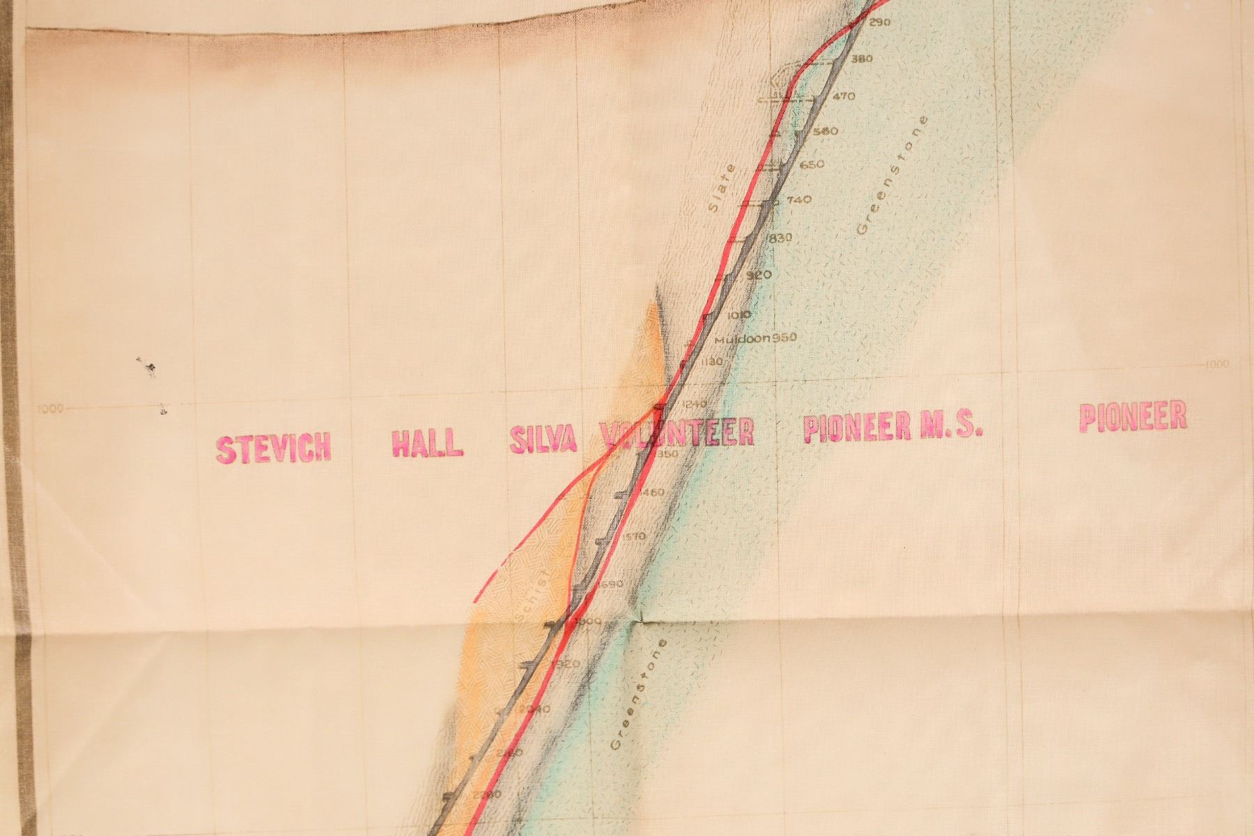 A colored illustration on linen depicting a cross-section of the Argonaut Shaft in Jackson, California, dated 1913. Signed very lightly at bottom right by E.C. Uren. Argonaut was a major gold mine, known now for being the site of the deadliest mining disaster in California history; in 1922, 47 miners were trapped underground when a fire broke out, and all died almost immediately. Good condition, with some creasing and light toning. Great (if morbid) piece of California mining history.