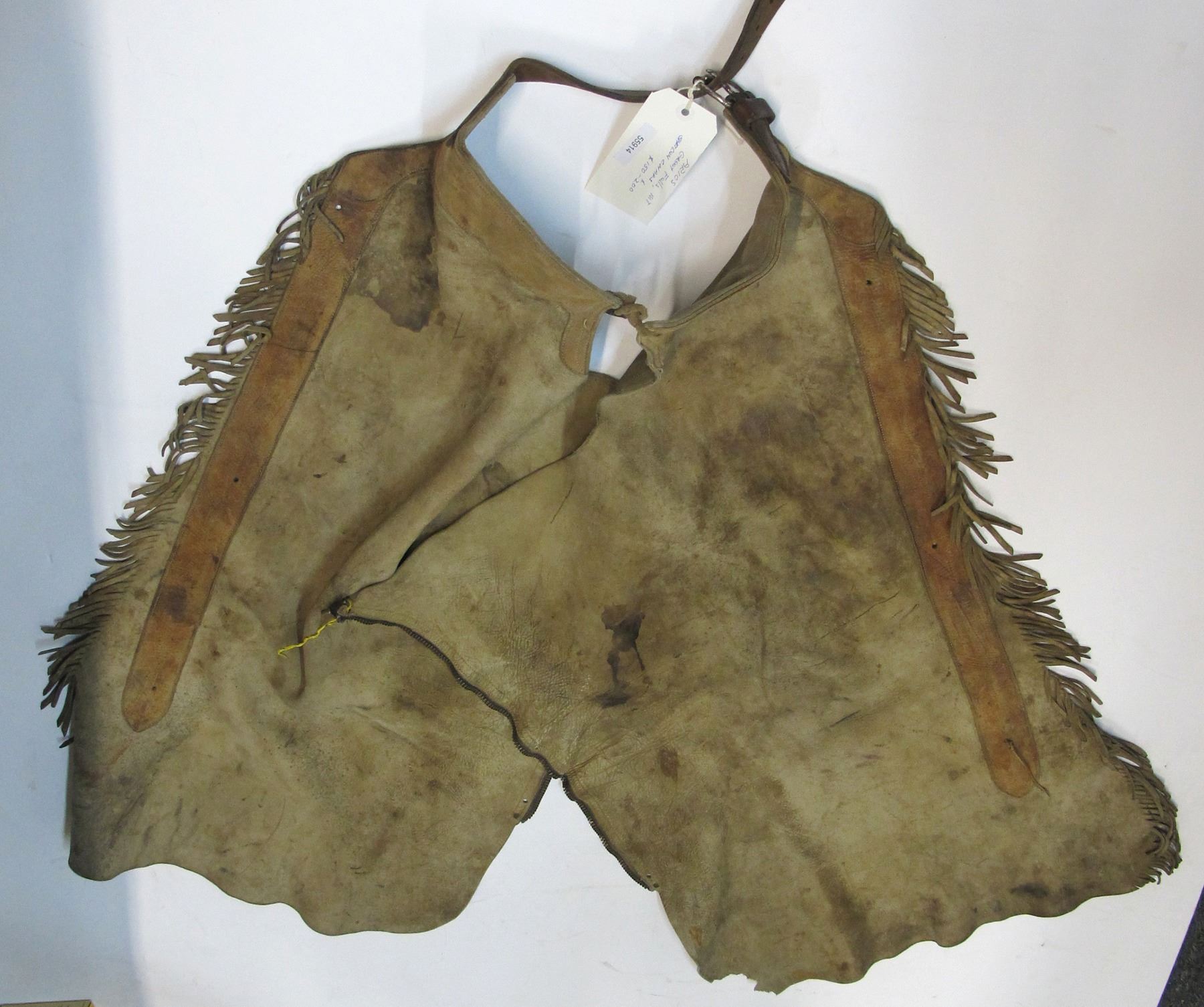 Shotgun chaps by Arios of Great Falls Montana. Two line rectangular punch on left belt. Fringe on left and right side. Zipper attach.