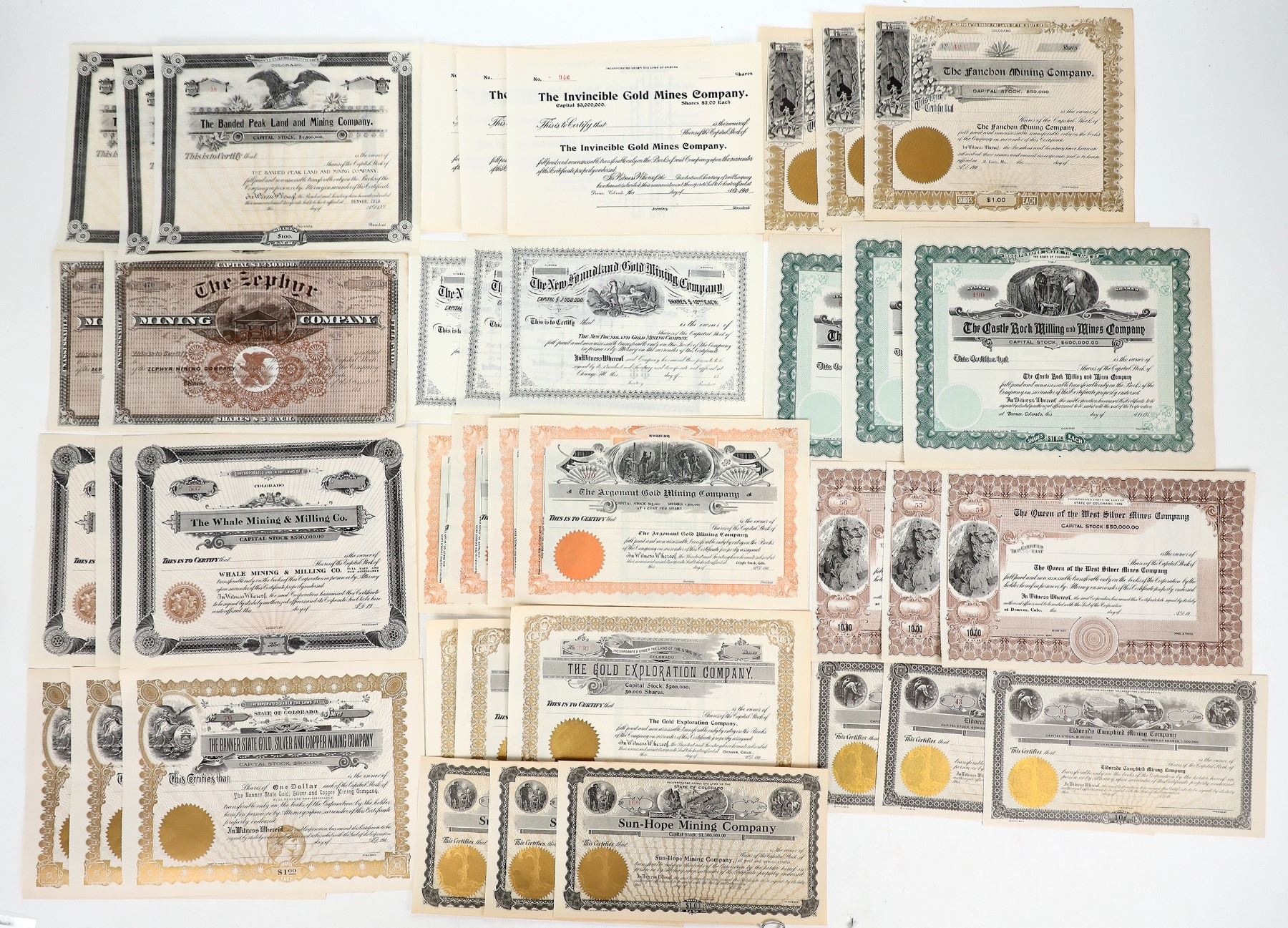 Lot of 36. (3) The Banded Peak Land and Mining Company Circa 1890's Cancelled. Denver, Colorado, (3) The Invincible Gold Mines Company Circa 1900's Cancelled. Arizona, (3) The Banner State Gold, Silver and Copper Mining Company Circa1900's, Cancelled, Colorado, (3) The Castle Rock Milling and Mines Company Circa 1900's, Cancelled, Denver, Colorado . (3) Eldorado Camp Bird Mining Company Circa 1900's , Cancelled. Nevada and more._x000D_