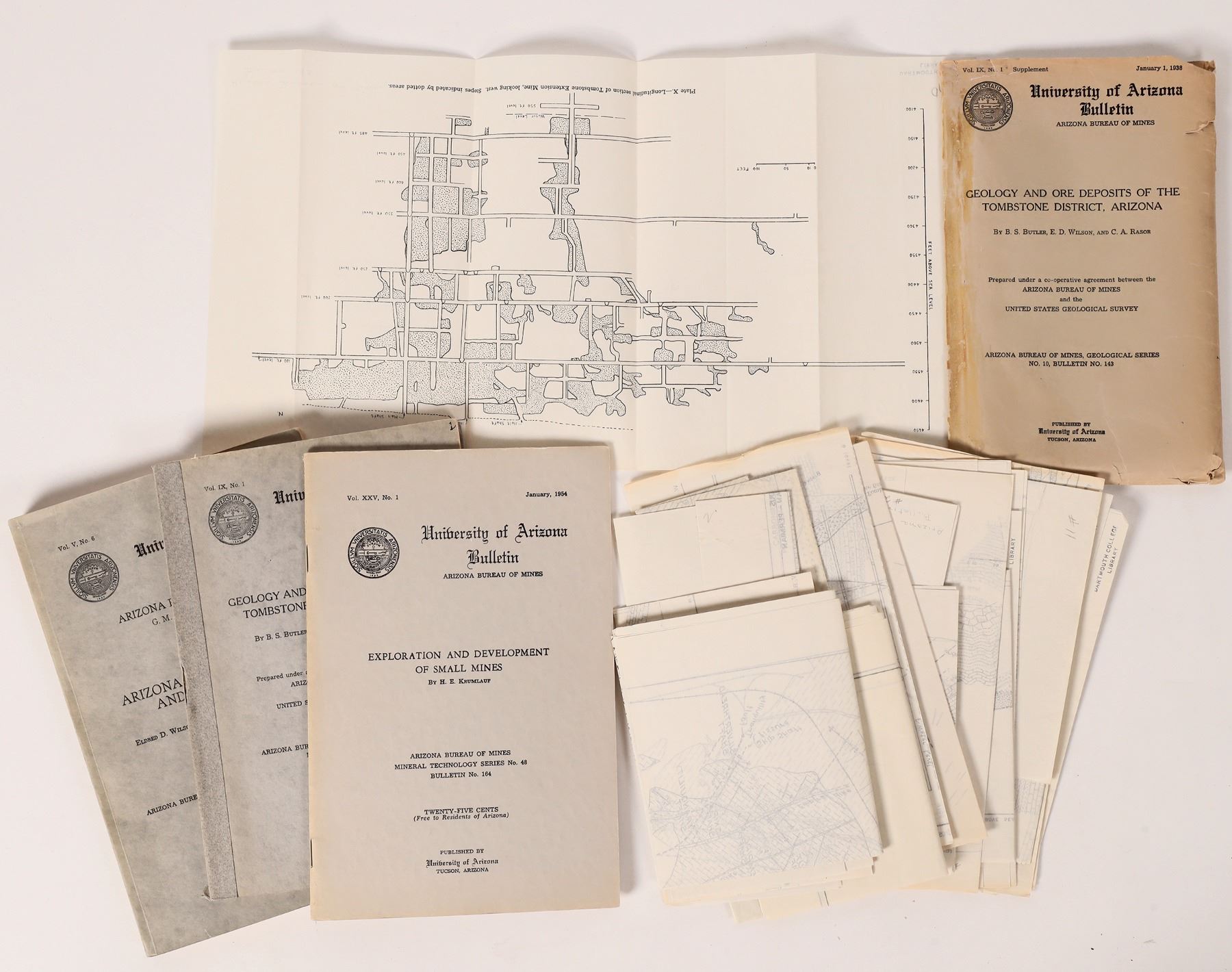 "Arizona Lode Gold Mines & Gold Mining", Bulletin 137, Vol. 5, No. 6, August 15, 1934, Publ. by University of Arizona Geologic map of Oatman District, 27 Illustrations, 6 plates ~ (6" x 9" SC, 261 pages)''Geology & Ore Deposits of the Tombstone Dist., Arizona" Bulletin 143, Vol. 9, No.1, January 1, 1938, Publ. by University of Arizona ~ Geologic map of Tombstone Dist. ~ 26 illus. (plates in separate envelope), 5 figures~ (6" x 9" SC, 114 pages) "Exploration & Development of Small Mines", Bulletin 164 Vol. 25, No. 21, January, 1954, Publ. by University of Arizona~ 8 illustrations involving stooping~ (6" x 9" SC, 34 pages)
