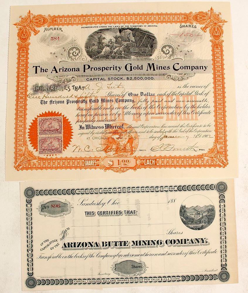 Pima District, Pima County. 1) Arizona Butte. Unissued. Incorporated in Ohio and datelined Sandusky, Ohio. Number 896. Slight fading on right, otherwise in very fine condition. 188-. 2) Arizona Prosperity. Number 584 for 150 shares to AJ Lutz. Signed by Smith and Tonkin(?). Two attached purple 5c revenue stamps. 1902. (Laguna Collection) HWAC# 62271 Date: Location: Pima County, Arizona
