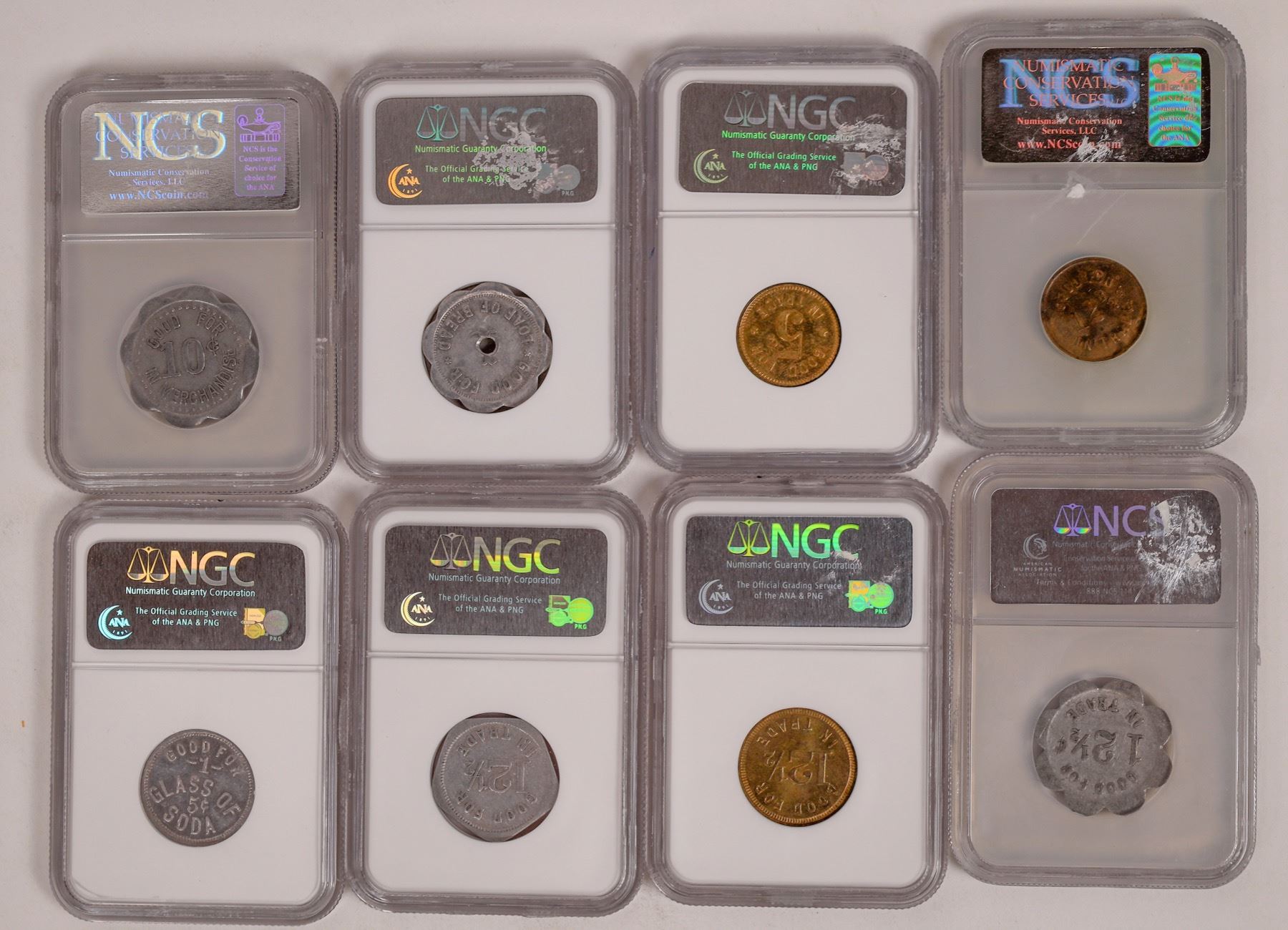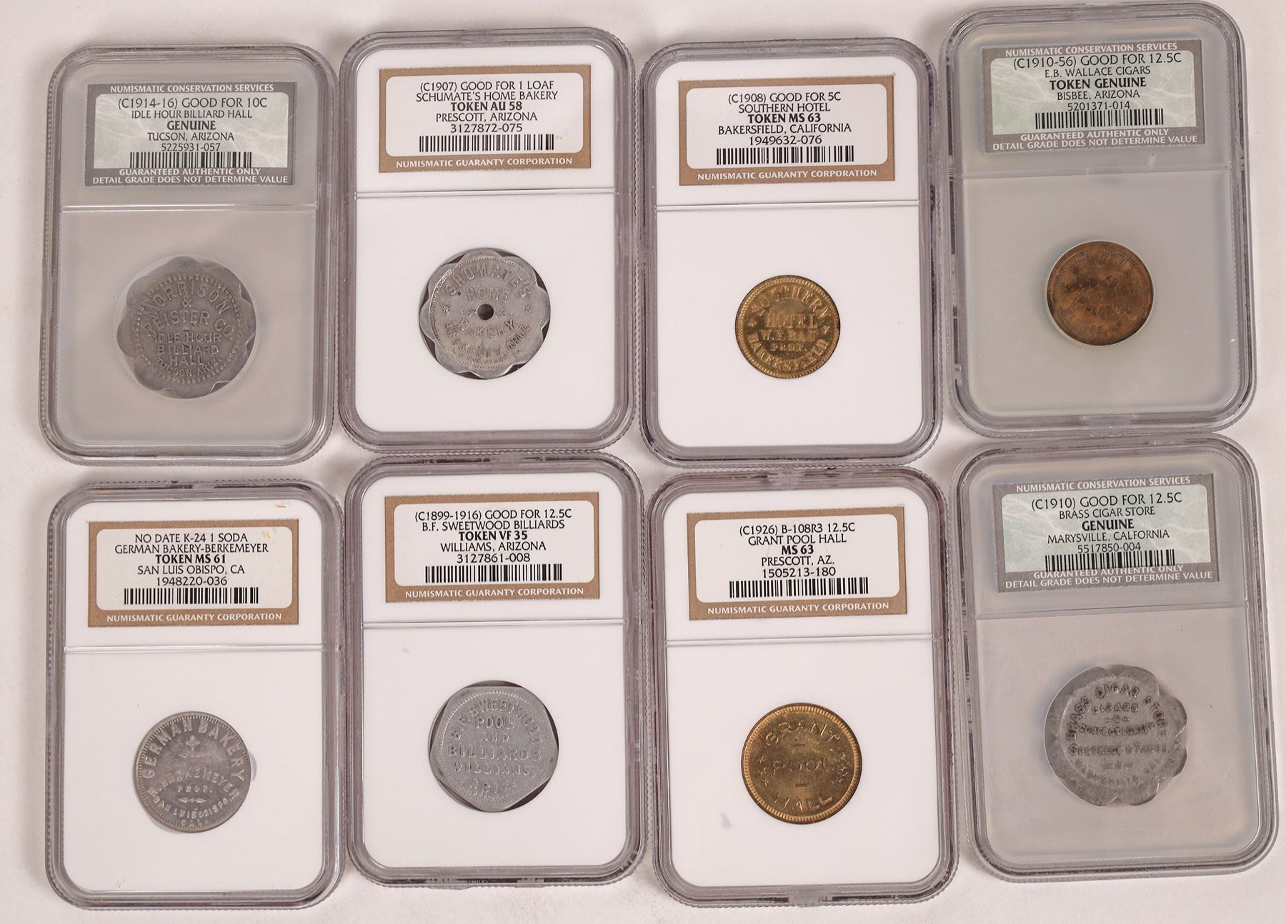 Lot of eight certified tokens from Western States: 1) MORRISON / & / REISTER CO. / IDLE HOUR / BILLIARD / HALL / TUCSON, ARIZ. // GOOD FOR / 10¢ / IN MERCHANDISE; Al., Sc8, 29 mm; certified Genuine by NCS. 2) B.F. SWEETWOOD / POOL / AND / BILLIARDS / WILLIAMS, / ARIZ. / L.A. RUB. STAMP CO. // GOOD FOR / 12½ / IN TRADE; Al., pent., 26 mm. Graded VF 35 by NGC. 3) E.B. WALLACE / CIGARS / & / TOBACCOS / BISBEE, ARIZ. // GOOD FOR / 12½¢ / IN TRADE; Br. rd., 21 mm. Certified Genuine by NCS. 4) GRANT / POOL / HALL // GOOD FOR / 12½ / IN TRADE; Br., rd., 24 mm. Graded MS 63 by NGC. 5) SHUMATE'S / HOME / BAKERY / PRESCOTT, ARIZ. / L.A. RUB. STAMP CO. // GOOD FOR / 1 / LOAF OF BREAD; Al., Sc8, 27 mm. Graded AU 58 by NGC. 6) Southern / Hotel / W.F. Rau / Prop. / Bakersfield // Good For / 5c / In Trade; Br., rd., 21 mm. Graded MS 63 by NGC. 7) BRASS CIGAR STORE / CIGARS / & / CONFECTIONERY / SPERBECK & TABER / MARYSVILLE, CAL. // GOOD FOR / 12½¢ / IN TRADE; Al., Sc8, 28 mm. Certified Genuine by NCS. 8) GERMAN BAKERY / H. BERKEMEYER / PROP. / SAN LUIS OBISPO, / CAL. // GOOD FOR / 1 / GLASS OF / 5¢ / SODA; Al., rd., 25 mm. Graded MS 61 by NGC. City: State:Arizona Date: