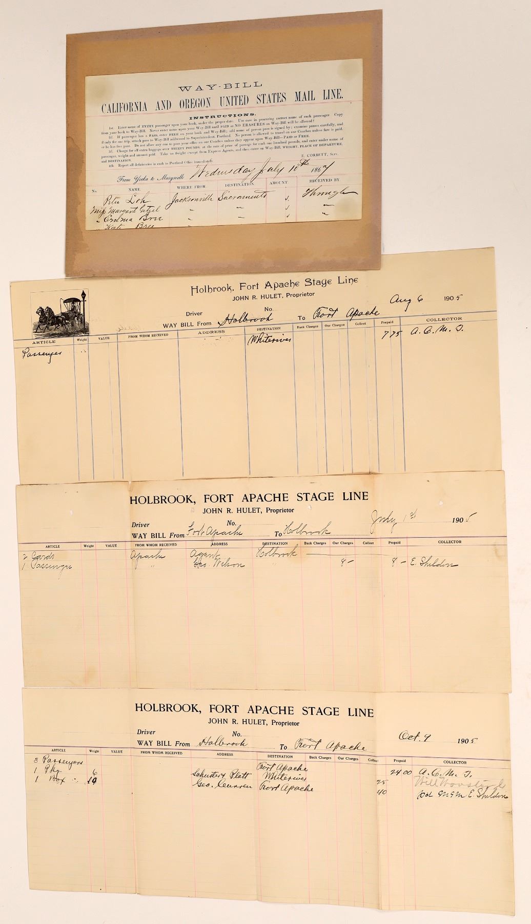 Lot of four waybills from the stagecoach days. 1867 California and Oregon United States Mail Line (mounted on paper); and three from 1905 the Holbrook, Fort Apache Stage Line, one with a nice horse and buggy vignette.