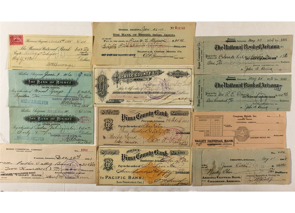Lot of 12 Arizona checks. Includes: Pima County Bank, Tombstone, RN-G1 (1880 and 1881); Cochise County Bank, Tombstone (1884); Phoenix National Bank, Phoenix w/ 2 cent adhesive (1898); three checks from the Bank of Bisbee, Transvaal Copper Mining Co., stamped Mexican Silver and with Mexican adhesive revenues on reverse (1906 and 1907); Arizona Central Bank, Arizona Brunswick Mining Co., Chloride (1919); Parker Valley Bank, Bogan Commercial Co. (1921); two National Bank of Arizona, Bogan Commercial Co., (1923); and an unused Congress Metals Inc. check c. 19--. All checks show signs of wear: cut or stamp cancels, light soiling. (Prag Collection)