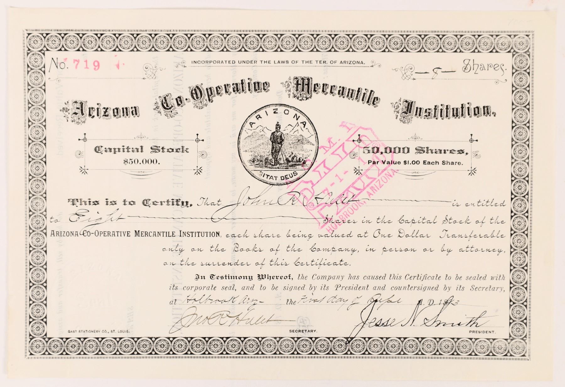 Inc. in Arizona. No. 719, issued for 8 shares to secretary John Hulet in 1893 in Holbrook. Signed by Jesse Smith (president) and Jno. Hulet (secretary). Stamp and cut cancelled. Black border and print, Arizona state seal vignette. Founded in 1881, the ACMI was the Arizona version of the ZCMI (Zion's Cooperative Mercantile Institution) in Salt Lake City. The ACMI was originally begun as a wholesaler for Mormon towns in the region, purchasing supplies at prices that individual settlements could not command. However, it quickly assumed an important credit function. Arizona Holbrook 1893
