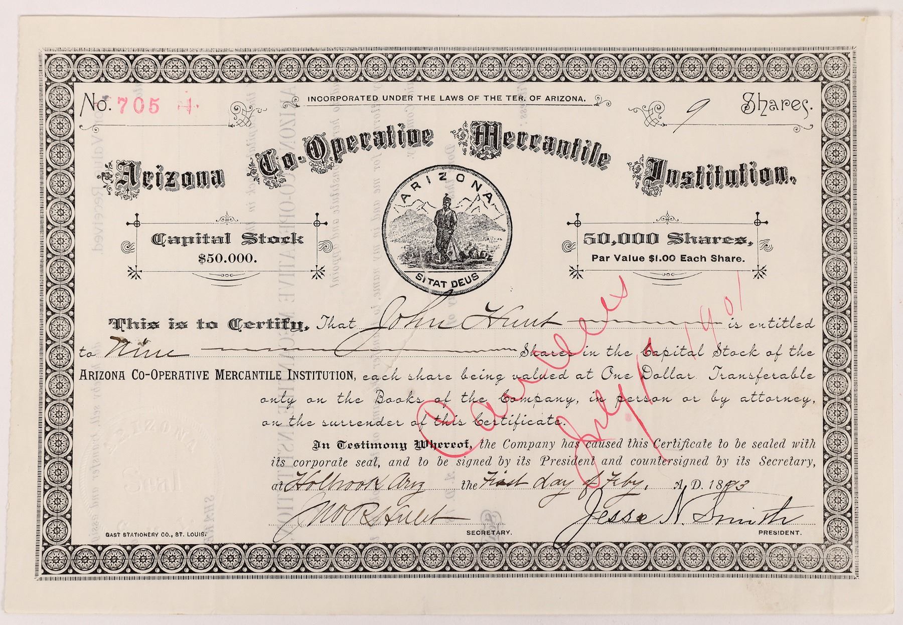 Inc. in Arizona. No. 705, issued for 9 shares to secretary John Hulet in 1893 in Holbrook. Signed by Jesse Smith (president) and Jno. Hulet (secretary). Pen and cut cancelled. Black border and print, Arizona state seal vignette. Founded in 1881, the ACMI was the Arizona version of the ZCMI (Zion's Cooperative Mercantile Institution) in Salt Lake City. The ACMI was originally begun as a wholesaler for Mormon towns in the region, purchasing supplies at prices that individual settlements could not command. However, it quickly assumed an important credit function.