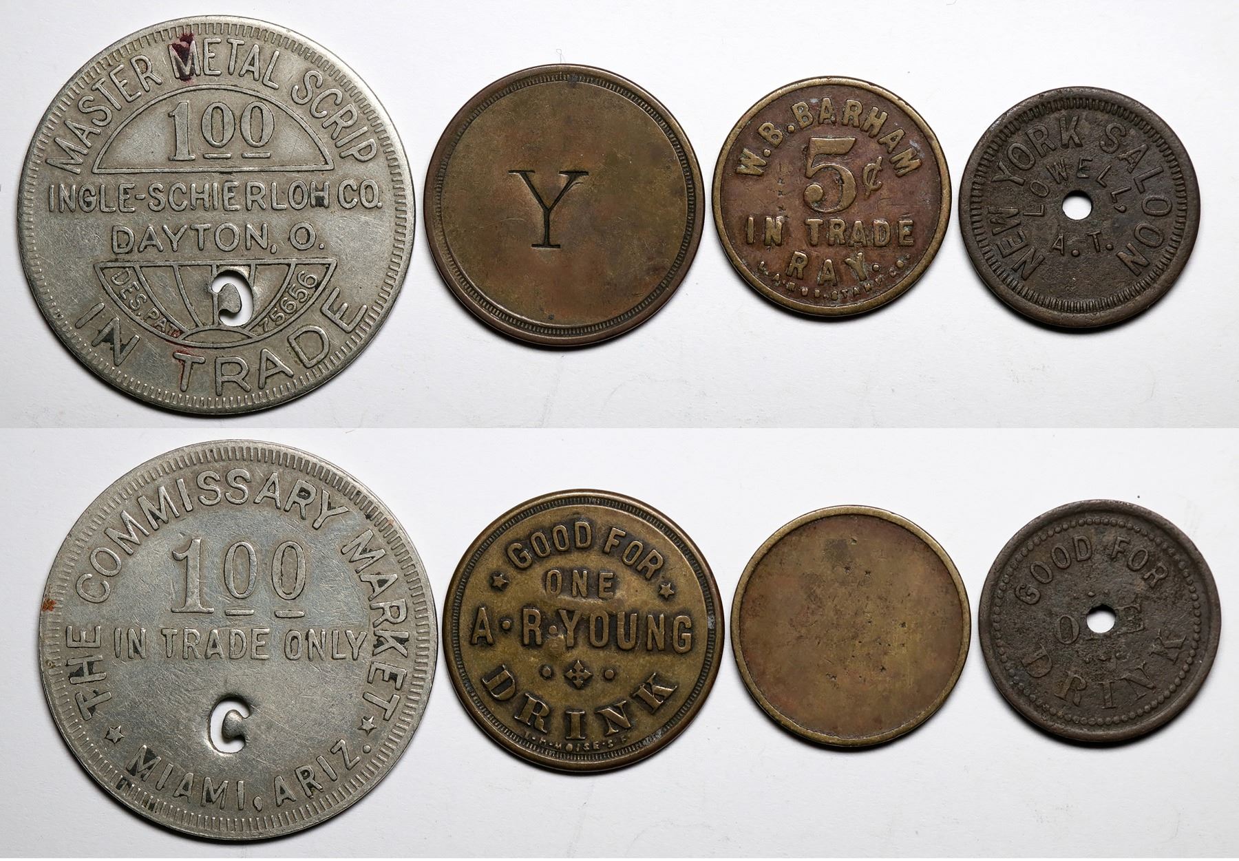 Lot of 4 from copper camps. 1. New York Saloon/Lowell/A.T.//G.F./ONE/DRINK. RD, Br, 22mm. 2. W.M. Barham/5¢/In Trade/Ray/L.A. Bus. Stamp Co. //blank. Rd, Br, 22mm. 3.G.F/ ONE/A. R. Young//Drink//Y. Rd, Br, 29mm. 4. The Commissary Market/1.00/In Trade Only/ Miami, Ariz.//Master Metal Scrip/1.00/Ingle-Schierloh Co./ Des. Pat 75656//C punched/Dayton,O./In Trade. Rd, W.M., 35mm.