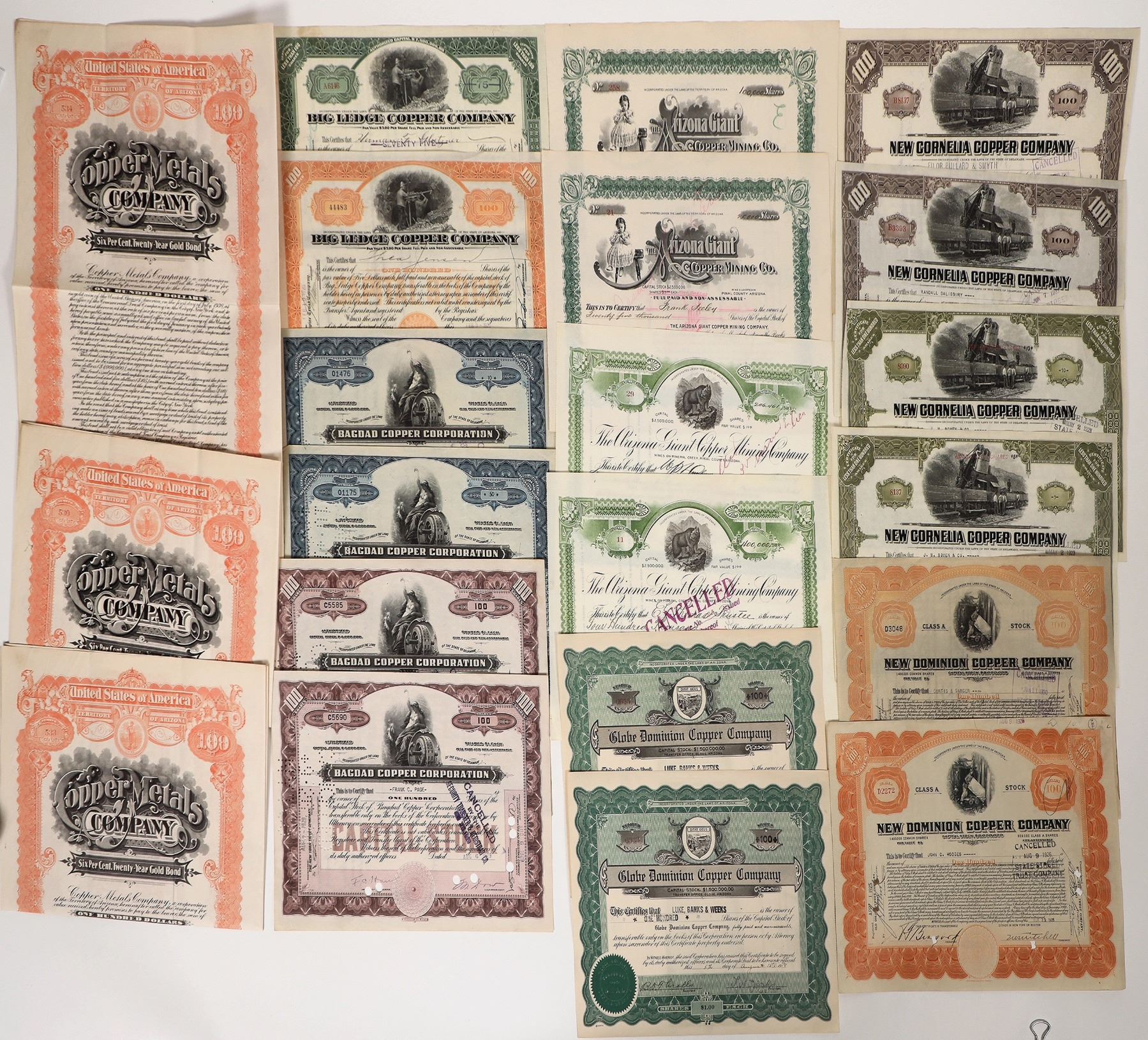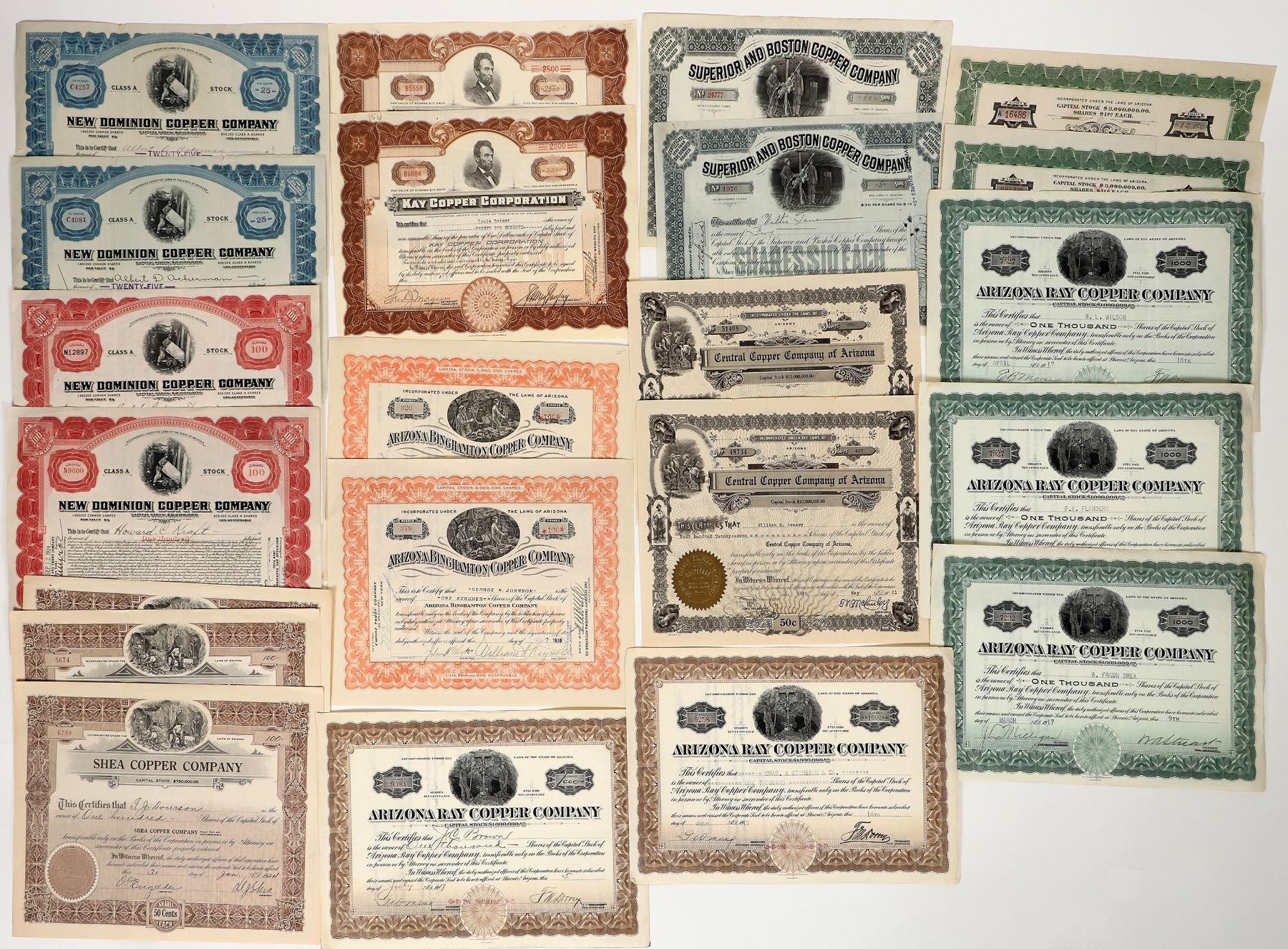 2 each except as noted, issued in 20th century. Arizona Ray green and brown, Pittsburgh-Jerome, Central Copper of Arizona, Superior and Boston, Arizona Binghamton, Kay Copper, 3x Shea Copper, corral, blue, orange New Dominion, olive and purple New Cornelia, Globe Dominion, Arizona Giant in 2 different green, blue and mauve Bagdad, 1 each orange and green Big Ledge. Bonds-3x 1910 Copper Metals.