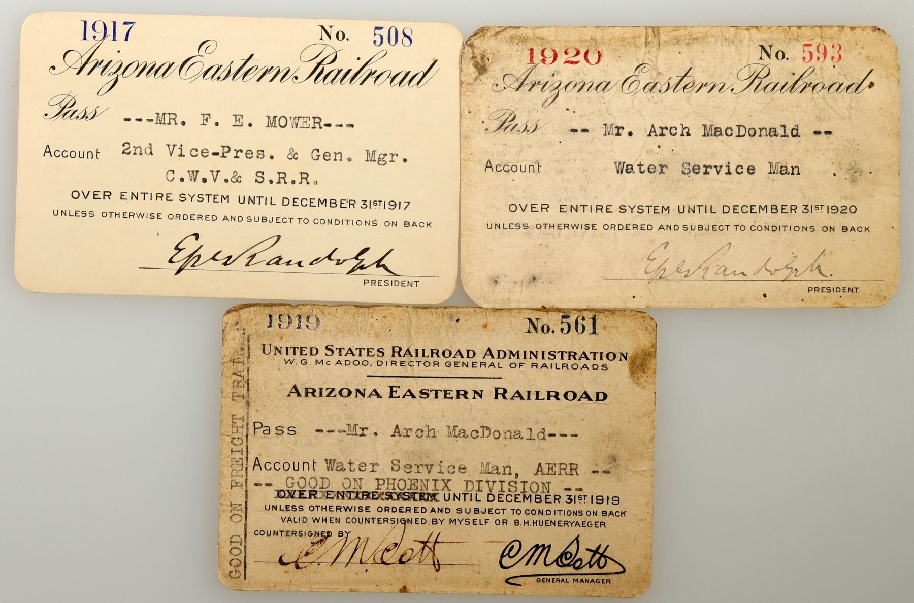 Lot of 3. Passes issued 1917, 1919, and 1920. Two signed by president Randolph. Two issued to Arch MacDonald, water service man. Two have soiling. The Arizona Eastern Railway was chartered as the Gila Valley, Globe and Northern Railway (GVGN) in 1885. Before completion to Globe in 1899, the GVGN came under the control of the Arizona Eastern Railroad (AE). The Arizona Eastern was leased by the Southern Pacific Railroad (SP) in 1905 and merged into the SP system in 1924.