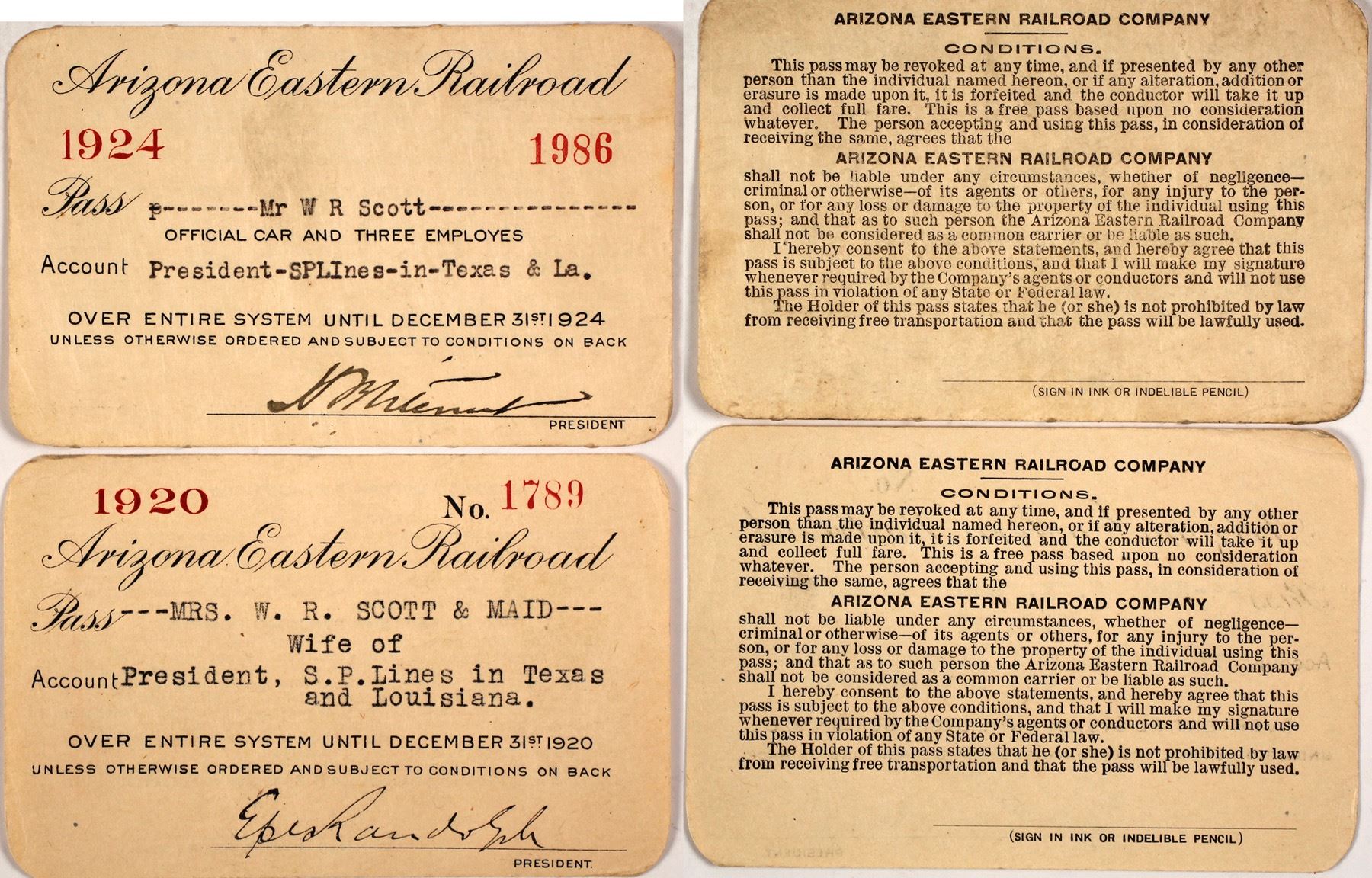 Two different: 1920 and 1924. Both are issued to W.R. Scott, president of the Southern Pacific Lines in Texas and Louisiana. Signed by two different presidents.Light soiling/toning. The Arizona Eastern Railway was chartered as the Gila Valley, Globe and Northern Railway (GVGN) in 1885. Before completion to Globe in 1899, the GVGN came under the control of the Arizona Eastern Railroad (AE). The Arizona Eastern was leased by the Southern Pacific Railroad (SP) in 1905 and merged into the SP system in 1924. (Potter Collection)