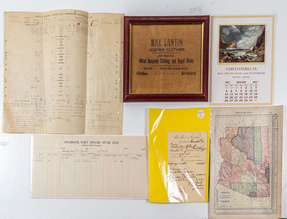 Arizona lot that includes: newer map; a framed broadside for Max Lantin, leading clothier in Globe Arizona 9" x 8"; a calendar from Phoenix for Camp–Tannehill company that depicts a picture of North Berwick Scotland; a map circa 1854, from the Pimas villages to Fort Fillmore (28" x 36"); stage line records and a railroad record; and a Tombstone receipt from the Bank of California circa 1886. Fantastic lot full of history and rare pieces. City: State: Arizona, Date: Inventory# 38324