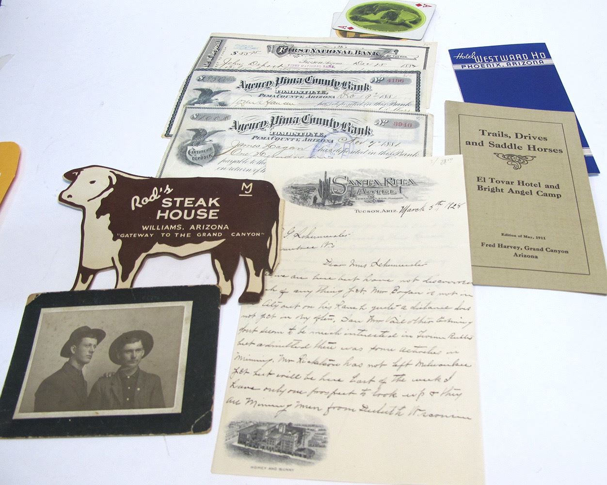 2 checks from Agency Pima County Bank(Tombstone) 1881, 1 from First National Bank 1882. Roosevelt dam and Mission San Xavier Southern Pacific playing cards. 3 pictorial letterheads from Santa Rita Hotel 1928. B/W photo of 2 brothers. Steer shaped die cut menu from Rod's Steak House. El Tovar Hotel at Grand Canyon trip rate pamphlet 4pp. Date: Location: Arizona HWAC # 54952