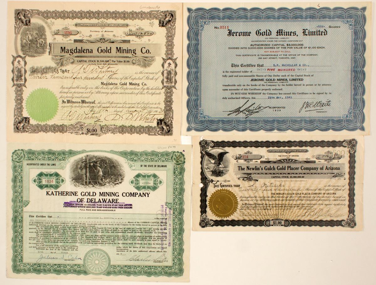 Group of 4, including: 1) Magdalen Gold Mining Co., dated 1903; 2) Newlin’s Gulch Gold Placer Company of Arizona, dated 1912; 3) Katherine Gold Mining Company, dated 1929, incorporated under the laws of the State of Delaware; and 4) Jerome Gold Mines, Limited, dated 1945, incorporated under the Ontario Companies Act. City: State: Arizona Date: hwac# 20942