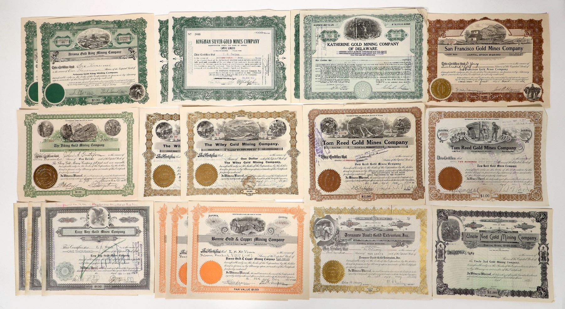 Issued- 3x 1916 Lazy Boy Gold, 3x 1923 Bannie Gold & Copper, 1927 Treasure Vault Gold Ext., 1919 and different 1929 Tom Reed, 2x 1906 Wiley Gold, 1x 1904 Viking Gold, 1928 and 1929 Katherine Gold of Delaware, 2x 1923 Kingman Silver-Gold, 1x 1922 San Francisco Gold-1" tear, 2x 1920 Arizona Gold King, 1x 1916 Oatman Bonanza Gold. Unissued-Uncle Ned Gold.