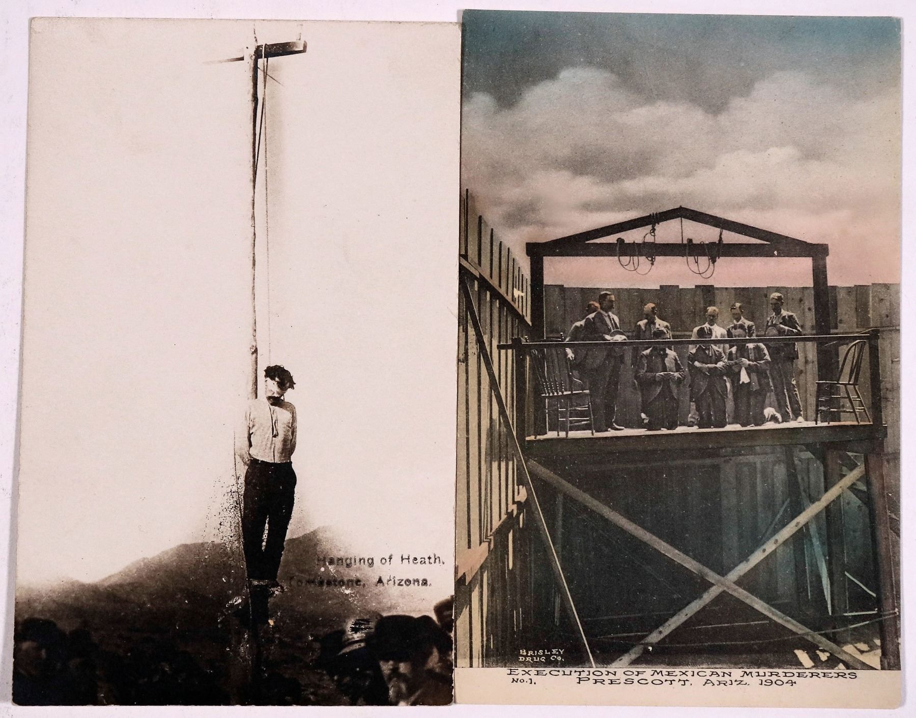 Two early hanging postcards of Arizona events. A.) Hanging of John Heath at Tombstone, real photo postcard, early, c1908-1915 printing. Heath's hanging was in 1884. Famous Tombstone photographer C.S. Fly captured the image and sold them into the 1940s according to Jeremy Rowe in "Arizona Real Photo Postcards," 2007 page 75. One of the later images of the Heath hanging was published by Fraser. This postcard is unused and in excellent condition. B.) Hand colored printed card by the Brisley Drug Co. entitled Execution of Mexican murderers Prescott Ariz 1904, no1. This card is a single card of a 3 card sequence and shows the 3 murderers on their knees perhaps receiving last rights.