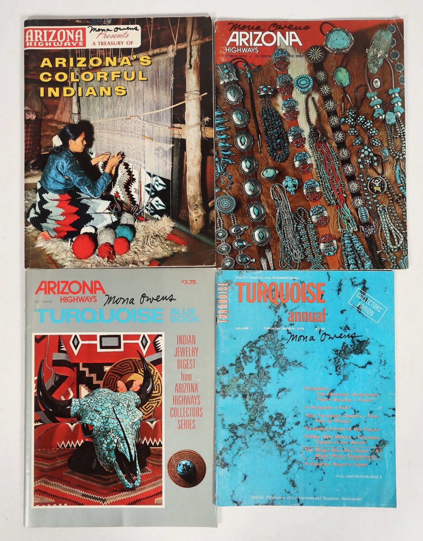 Arizona Highway magazine (3), and collector's edition Turquoise Annual magazine (1). Total of 4 magazines from approximately 1976. In good condition with slightly worn edges and covers. These magazines have "Mona Owens" written on the cover and the first page in sharpie, likely from a previous owner. See photo.