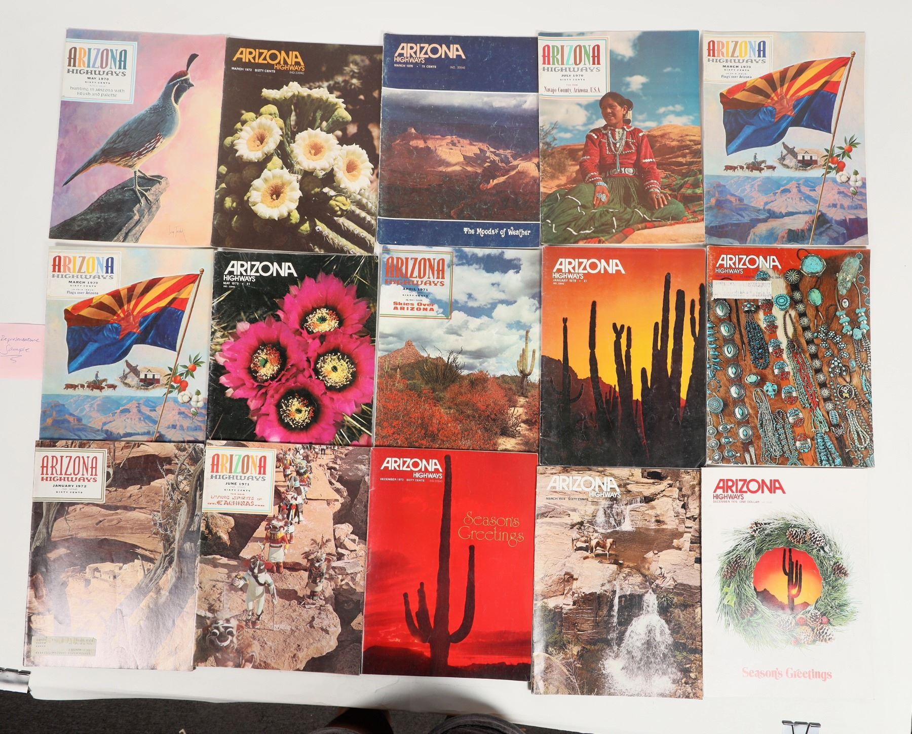 "Arizona Highway" magazine, 151 issues. This magazine is known for its gorgeous cowboy-inspired and Native American art themed covers. Issues date from the 1940's to the 1980s. Issues are as follows: 40s (2), 50s (45), 60s (7), 70s (67), 80s (30), for a total of 151 magazines. The older magazines are well read with worn pages and spines. The quality improves as the issues become more modern. Good collection in fair condition. See photo.
