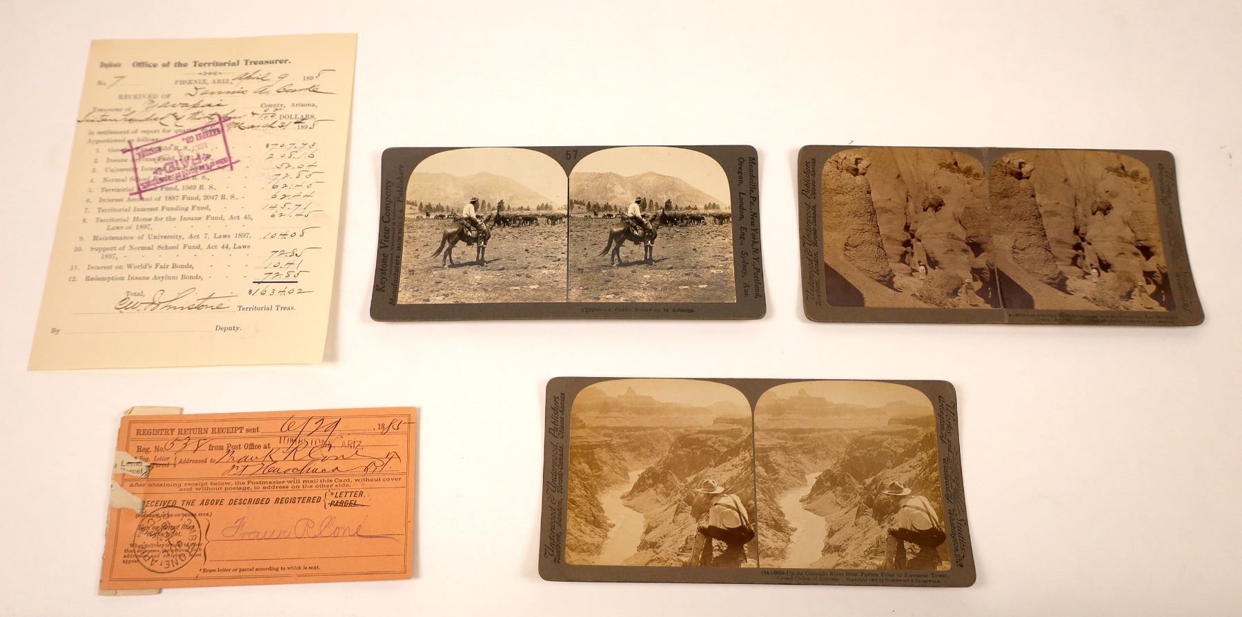 Lot includes three stereoviews. All are Keystone or Underwood views. Includes a cattle roundup in Arizona, Up the Colorado River, from Pyrites Point to Zoroaster Tower, Grand Canon of Arizona, with a cowboy overlooking the Grand Canyon, and Labyrinthe, ways through the lava ash formation, Red Mountain, Crater, Arizona. This one is damaged with a fold down the middle. Taped on the back. Two women pictured on the rock formation. The rest of the lot is paper including a return receipt from Tombstone, 1885; and a cashier's receipt from Cochise County Bank, Tombstone, Ariz. datelined Benson, A.T. 1886. Others include a note from Bisbee, 1881, a check from Pima County Bank, Tucson, A.T., dated 1879 and a govt. document regarding the Apache subsistance, 1873.
