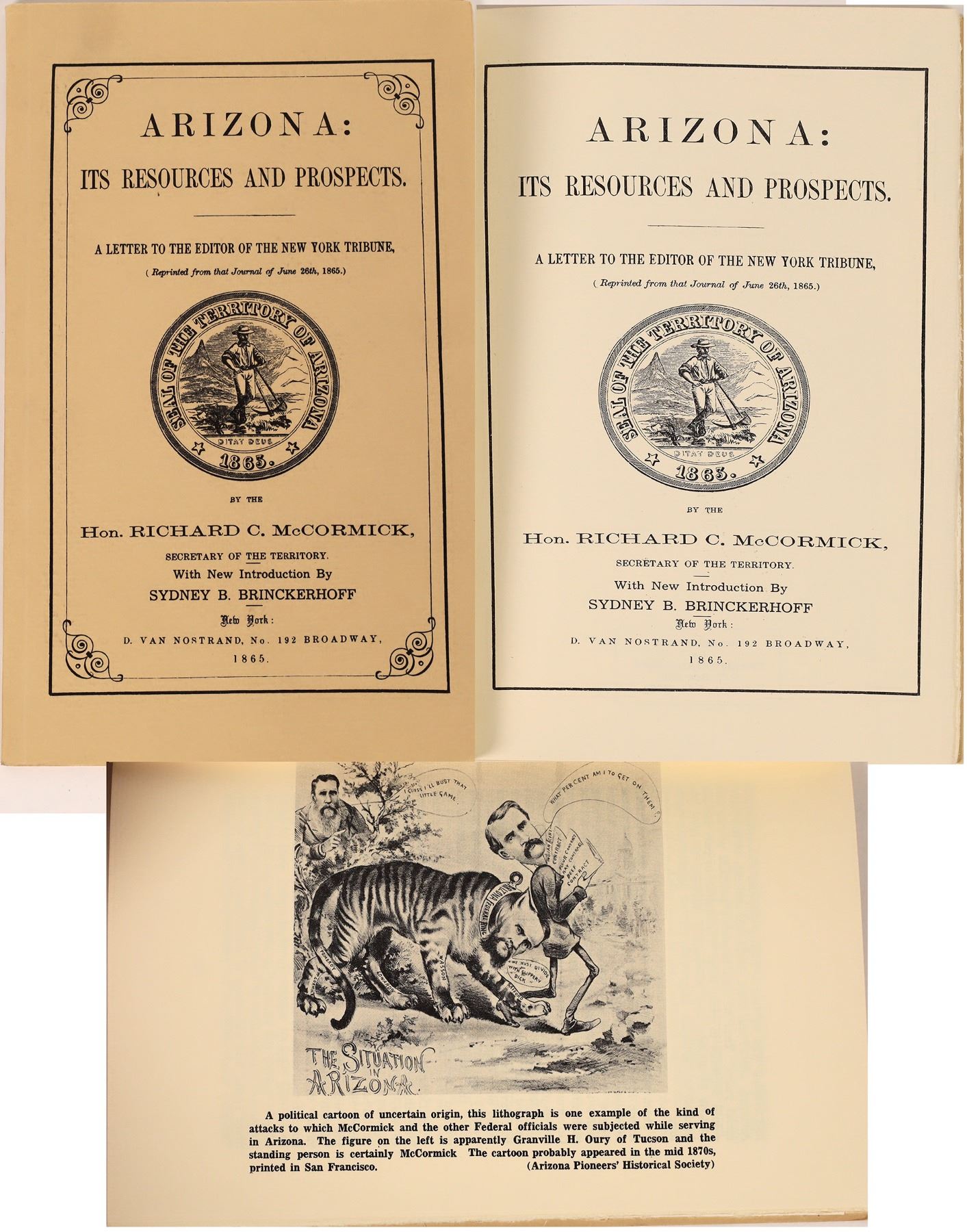 1968 reprint of 1865 Arizona letter to the Editor of the New York Tribune by Hon. Richard C. McCormick. He outlines the advantage of the counties and a note on mining. Has fold out map of Arizona and surrounding states. Fred says a great forward n "Slippery Dick" Richard Cunningham McCormack. Considered rare, in plastic and near new condition. Approx. 38 pages. Arizona 1865