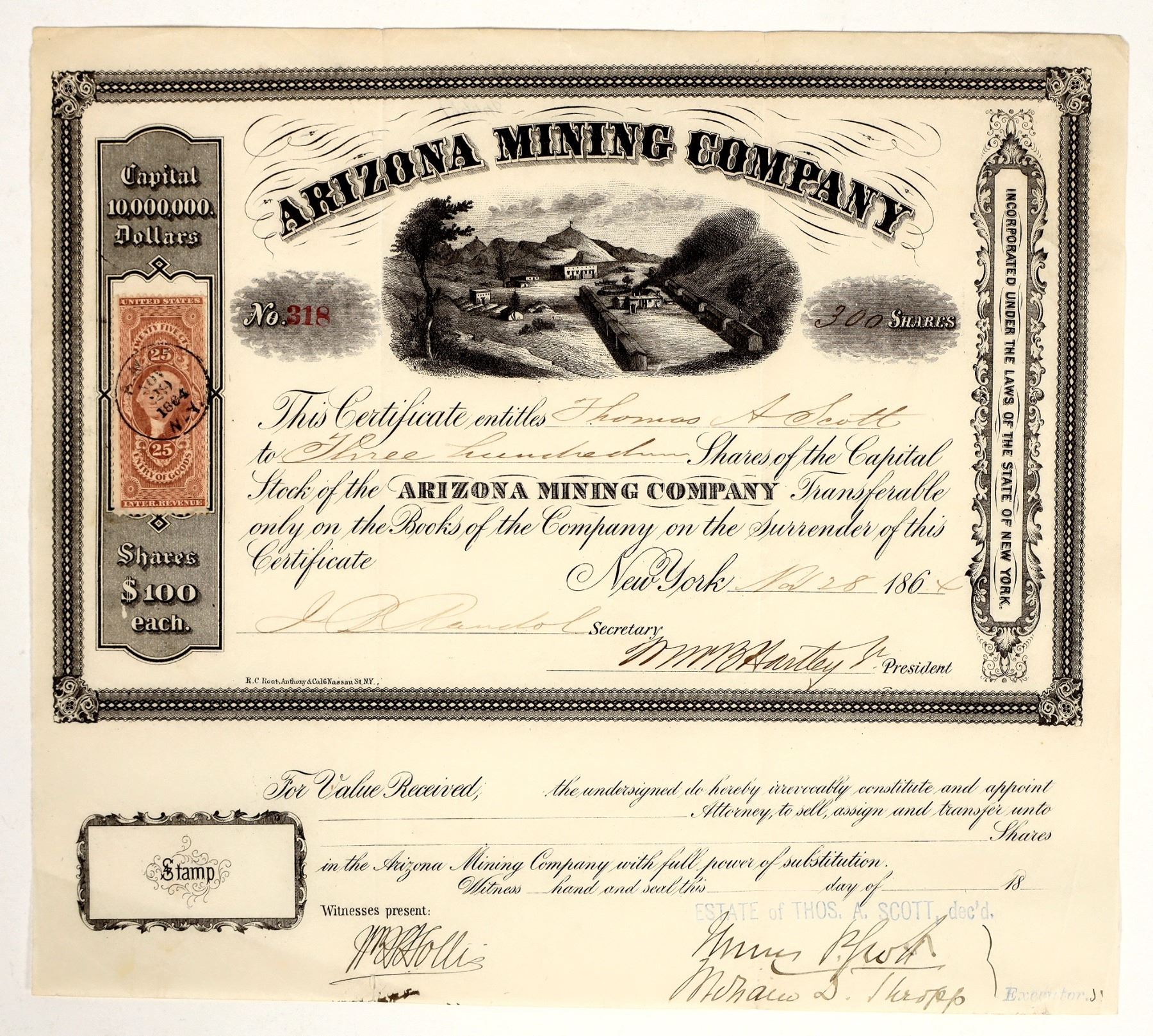 Inc. in New York. Cert #318 for 300 shares issued to Thomas A. Scott in 1864. Signed by J Randall as secretary and N.M Hartley? as president. Great piece with Heintzelman Mine vignette top center. The famous company name appears to have been used to promote a property other than the Heinselman, which was where the name had its historical roots. Stanton Kieth reported in his "Index of Mining Properties in Pima County" that a company by this name had properties at Baboquivari District in the Baboquivari Mountains, significantly west of Arivaca. 8.5 x 9.5" Folds, pinholes. 25 cent adhesive US IR stamp with tied cancel at left.