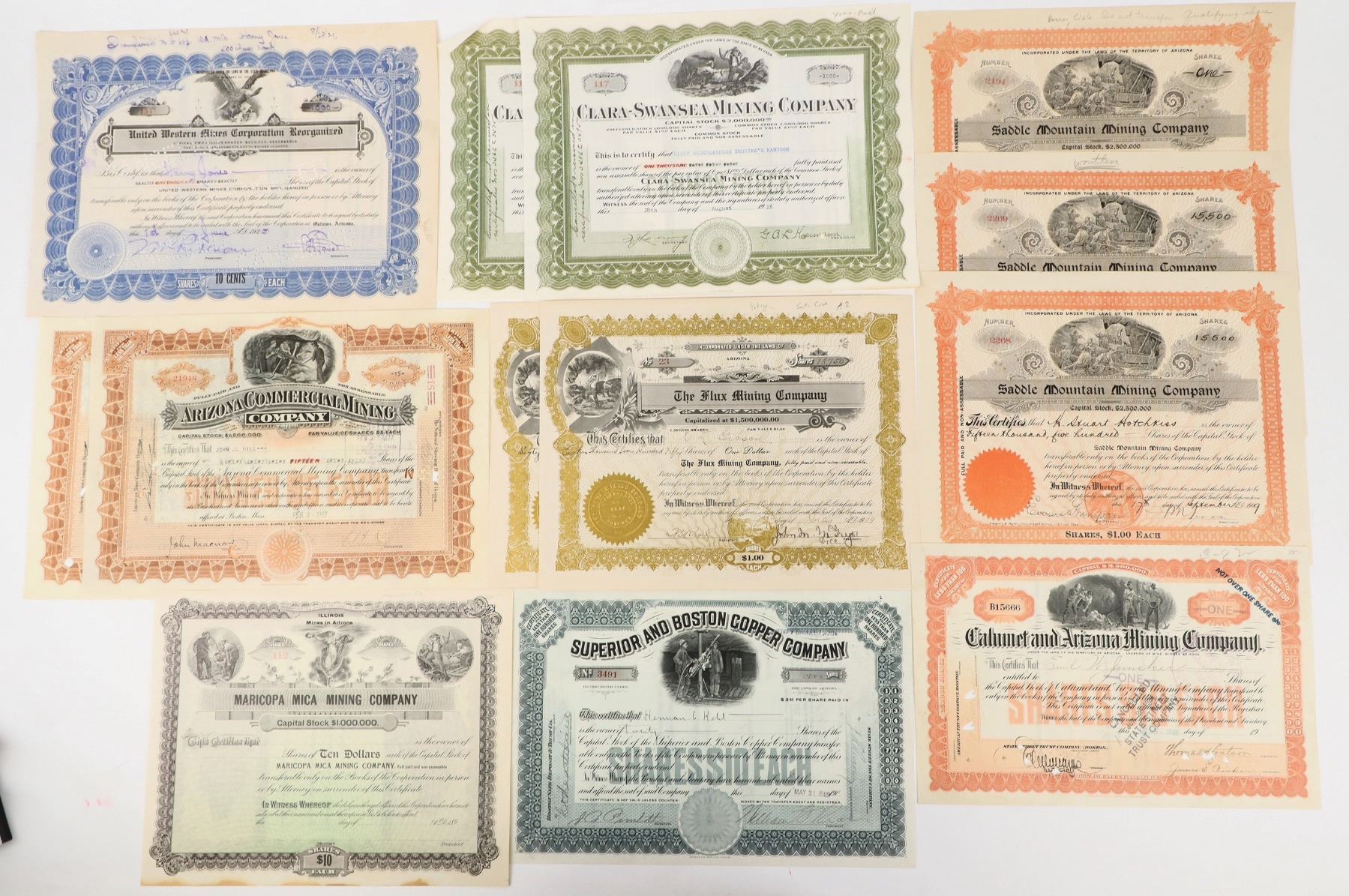 Lot of 11. Some duplication. Maricopa, Santa Cruz, and Gila Counties. Includes: Calumet & Arizona MC (1908); Superior & Boston Copper Co. (1909); Maricopa Mica MC (unissued 1890s); Flux MC (1919, x2); Saddle Mountain MC (1907-09, x3); Arizona Commercial MC (1927, x2); Clara-Swansea MC (1926, x2); and United Western Mines Corp. (1925).