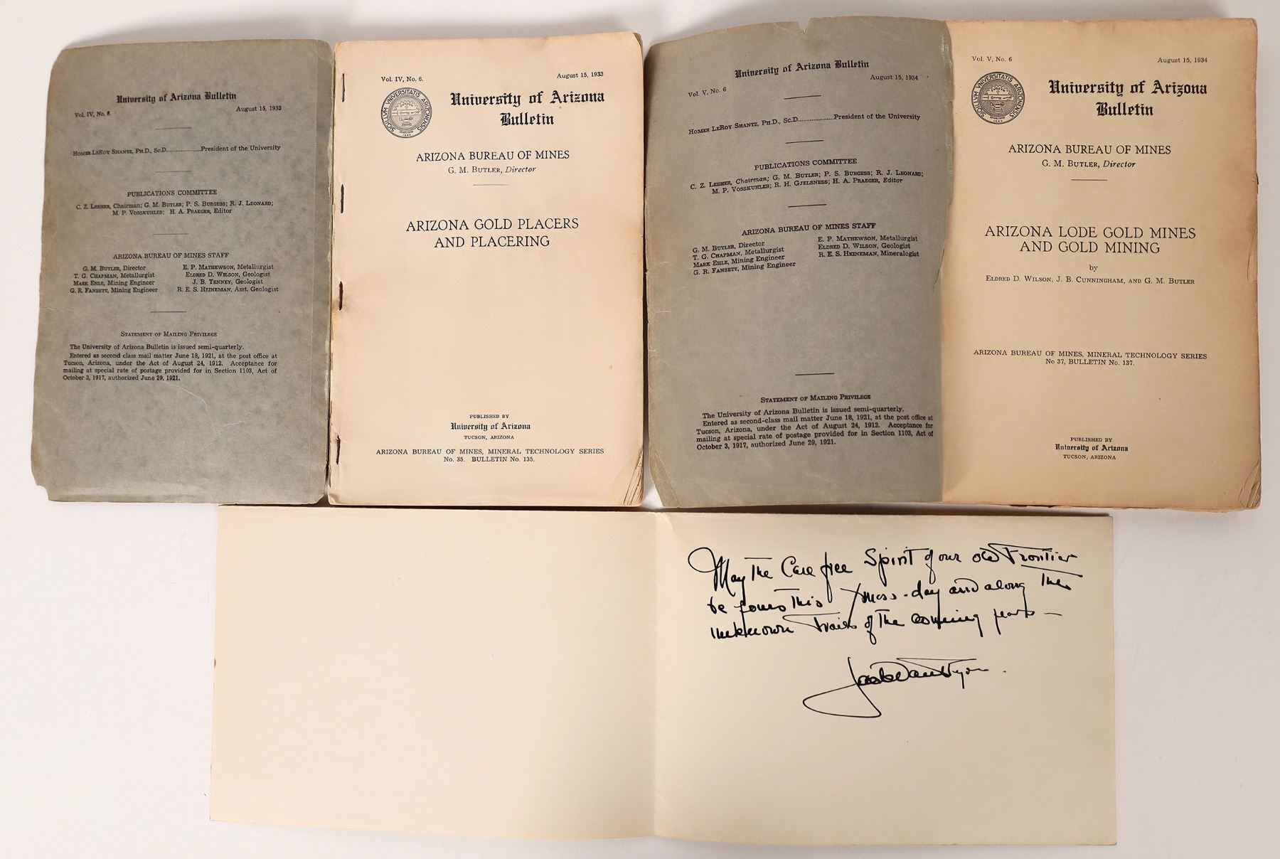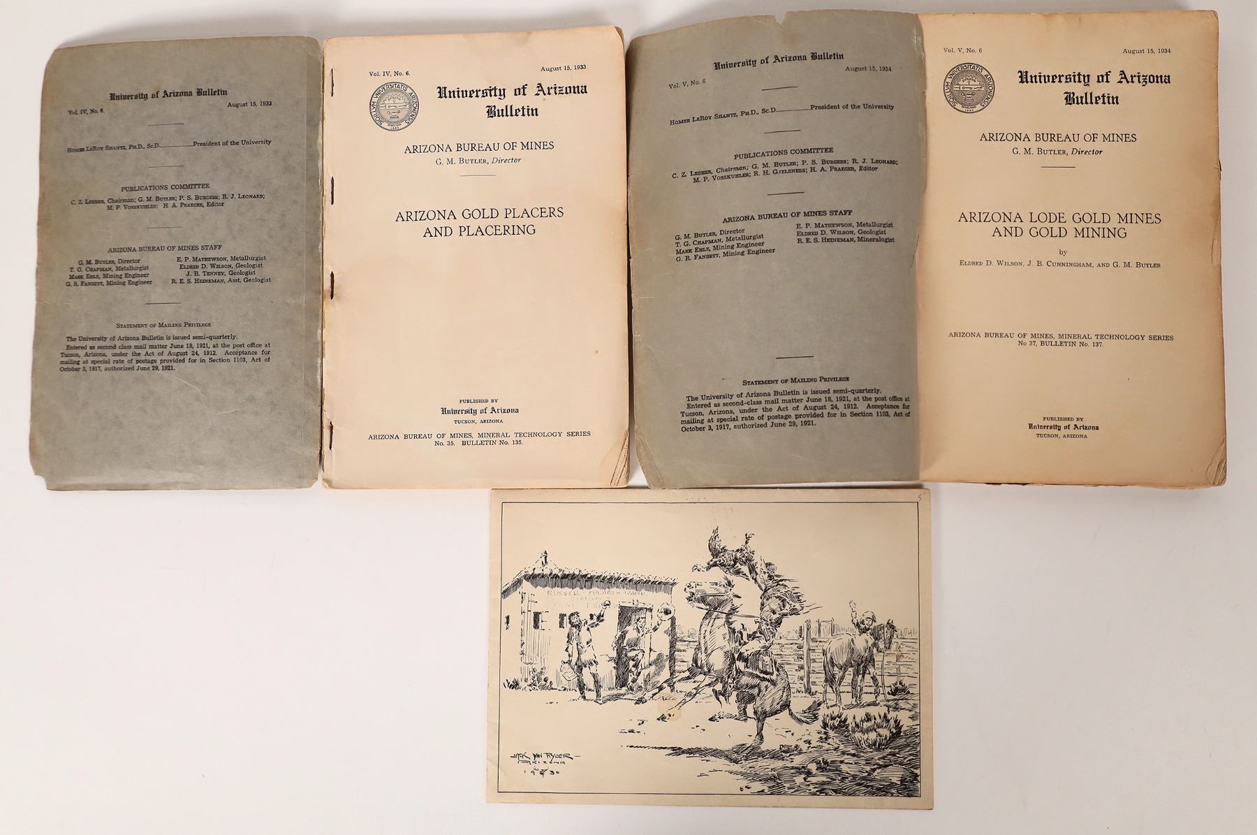 Lot of three.1) 1933 University of Arizona Bulletin. Bureau of Mines. Titled Arizona Gold Placer and Placering. Written by GM Butler. 148 pages. 14 plates and 15 figures. 2) 1934 University of Arizona Bulletin. Bureau of Mines. Titled Arizona Lode Gold Mines and Gold Mining. Written by Wilson et al. 261 pages. 27 figures and 6 plates. 3) A pleasant sketch by Jack Van Ryder in 1930. Cowboys in front of a Russell, Majors and Wadell station. Arizona
