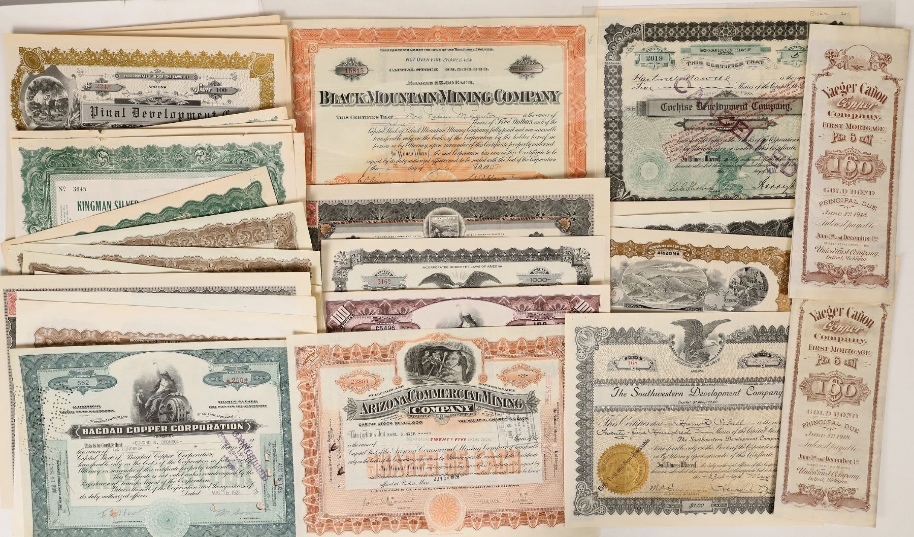 Lot of 33. Includes: Black Mountain Mining Co. (1907); Arizona Commercial Mining Co. (1928); Cochise Dev. Co. (1906); Southwestern Development Co. (1906); Yaeger Canon Copper Co. (two 1903 bonds); Globe Dominion Copper Co. (1917); United Eastern Mines Corp. (5, 1931); Arizona-Mexican Mining & Smelting Co. (1905); Oatman Bonanza Gold Mines Co. (1916); Mildred Gold Mines Co. (two stocks, 1909); Bagdad Copper Corp. (2 stocks, 1928 & 1929); Oatman-Combination MC (1922); Oatman Apex Mining Co. (1916); Kay Copper Corp. (1924); Kingman Silver-Gold Mines Co. (5 uniss.); Confidence MC (3 uniss.); Arizona-Mexican Mining & Smelting Co. (uniss.); and Pinal Development Co. (3 uniss.).