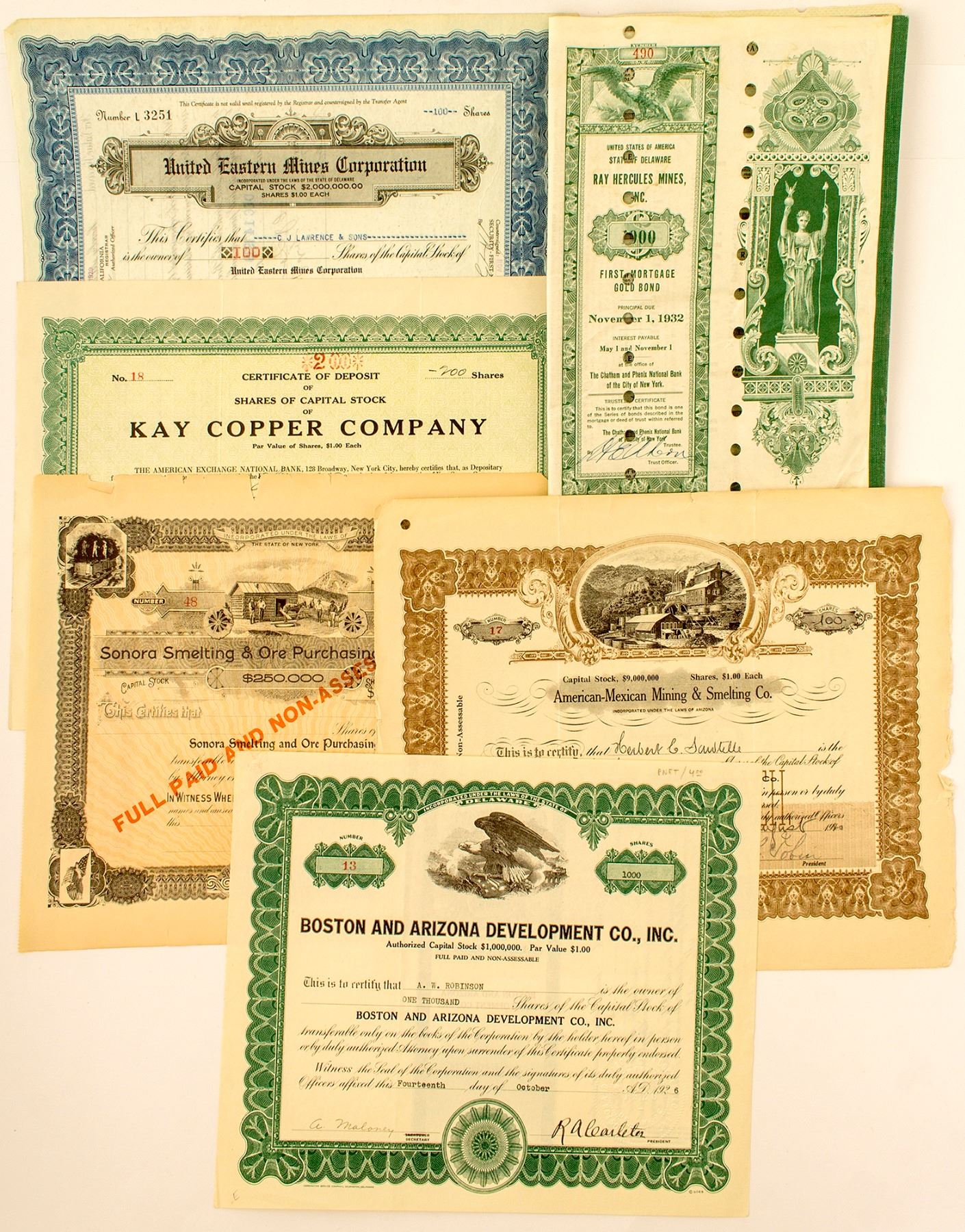 1 each from United Easter Miners Corporation issued 1929, Kay Copper Company issued 1923, Sonora Smelting & Ore Purchasing Company not issued, Ray Hercules Mines, BOSTON AND ARIZONA DEVELOPMENT CO., INC. issued in 1926, American-Mexican Mining & Smelting Co. issued 1920.