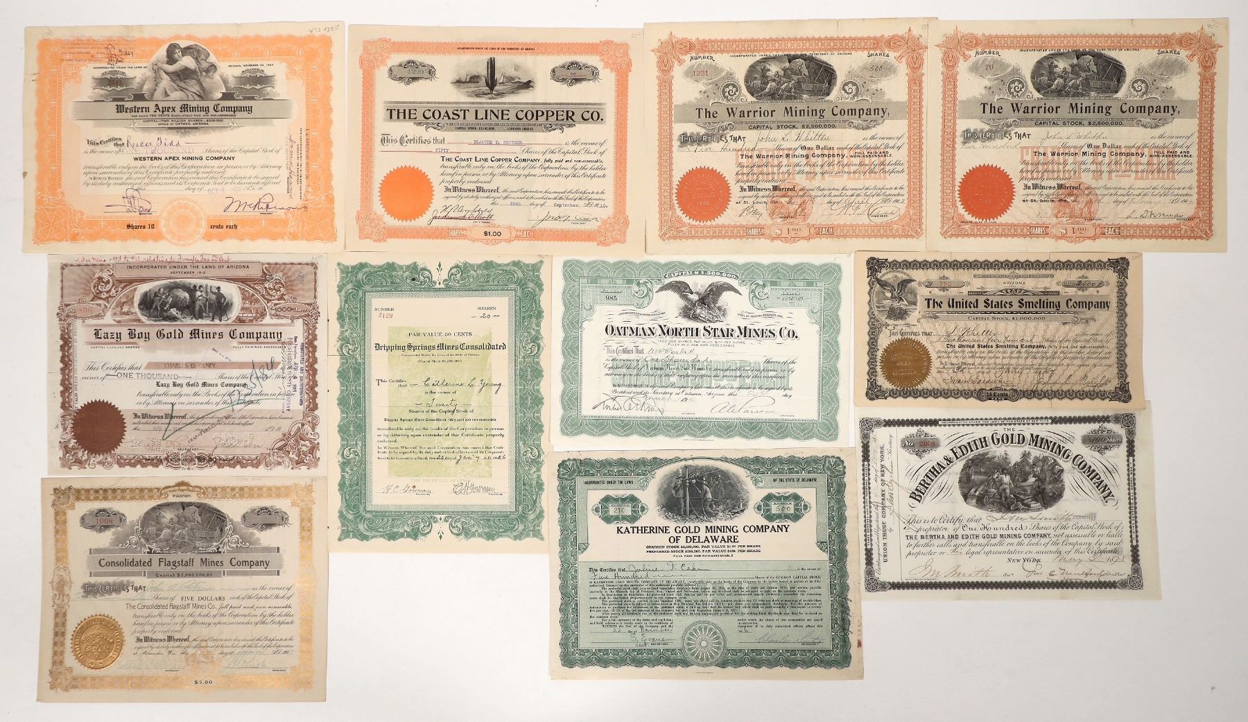 Issued-1907 Cons. Flagstaff, 1916 Oatman North Star, 1926 Katherine Gold of Delaware, 1916 Lazy By Gold, 1878 Bertha & Edith Gold, 1926 Dripping Springs, 1903 and 1904 Warrior-1903 has, wrinkles and crease tears, 1907 US Smelting-1" left crease tear, 1910 Coast Line Copper, 1927 Western Apex-small crease tears. Please inspect.