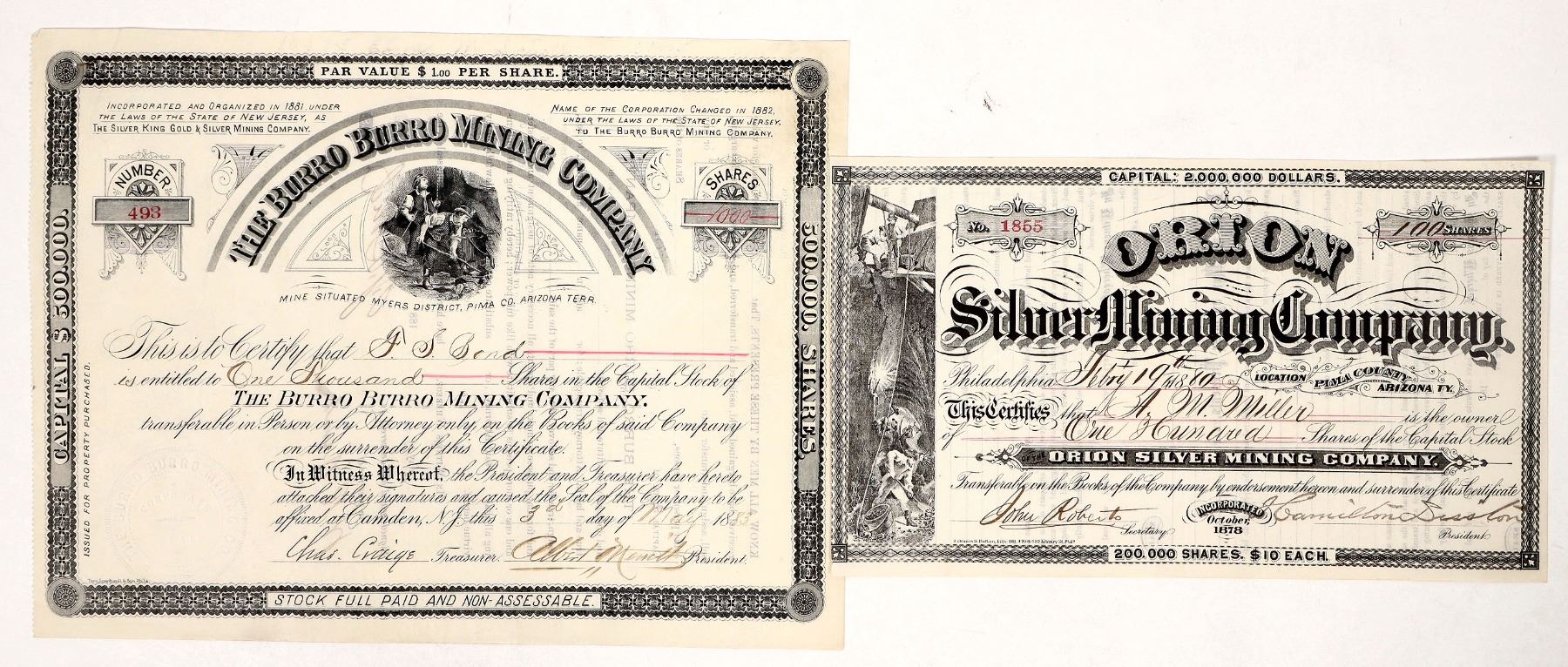1)Issued-1883 Burro Burro Mining. Organized in 1881 as The Silver King Gold & Silver Mining Company. The name was changed in 1882 to The Burro Burro Mining Company". Myers Mining District, Pima, Arizona. 2) 1880 Orion Silver Mining with nice mine shaft vignette. Mine is in the Santa Rita and Patagonia mountains of Pima County. The Orion started with sharing offices with the Tombstone Gold & Silver Mill and Mining Company. The Tombstone people quickly moved to separate from the Orion which they did not think much of the Orion property - as a matter of fact they thought it was a "no good mining property."