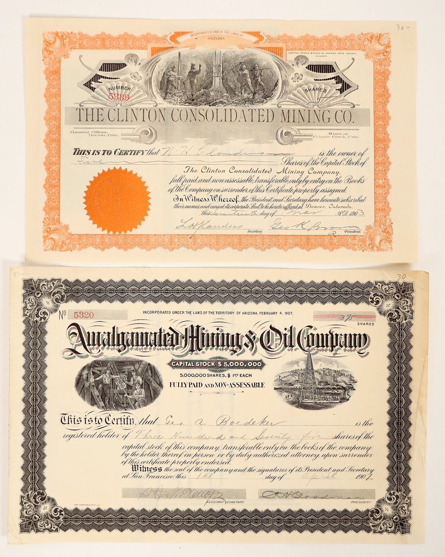 Issued 1907 Amalgamated Mining & Oil-wrinkled, and 1903 Clinton Cons. Mining-2 pin holes. Both with mining vignettes.[ Arizona