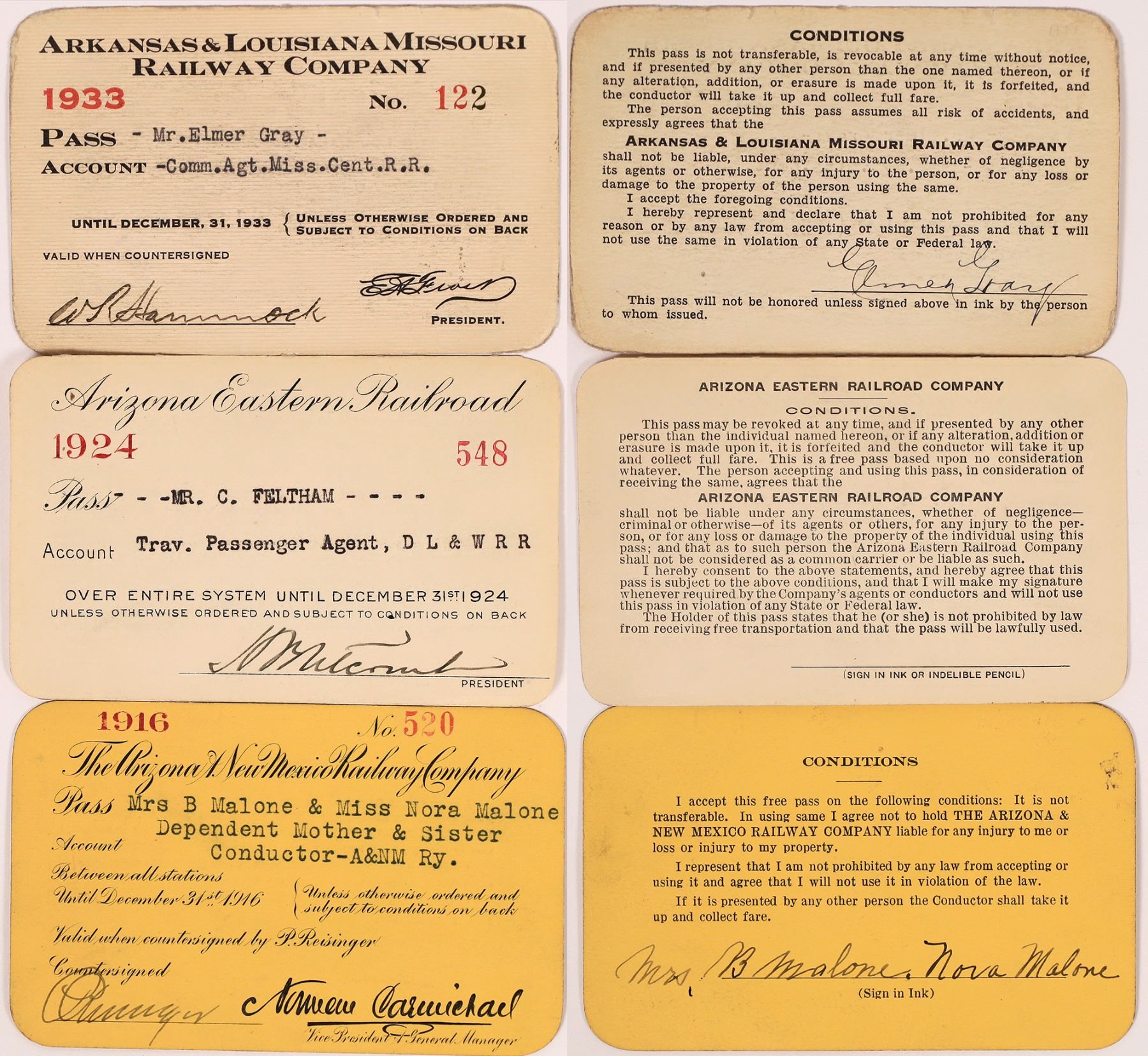 Three railroad passes: 1) The Arizona & New Mexico Railway Company, 1916, No 520, issued to Mrs B Malone and Miss Nora Malone; 2) Arizona Eastern Railroad, 1924, No 548 issued to Mr. C. Feltham. 3) Arkansas & Louisiana Missouri Railway Company, 1933.