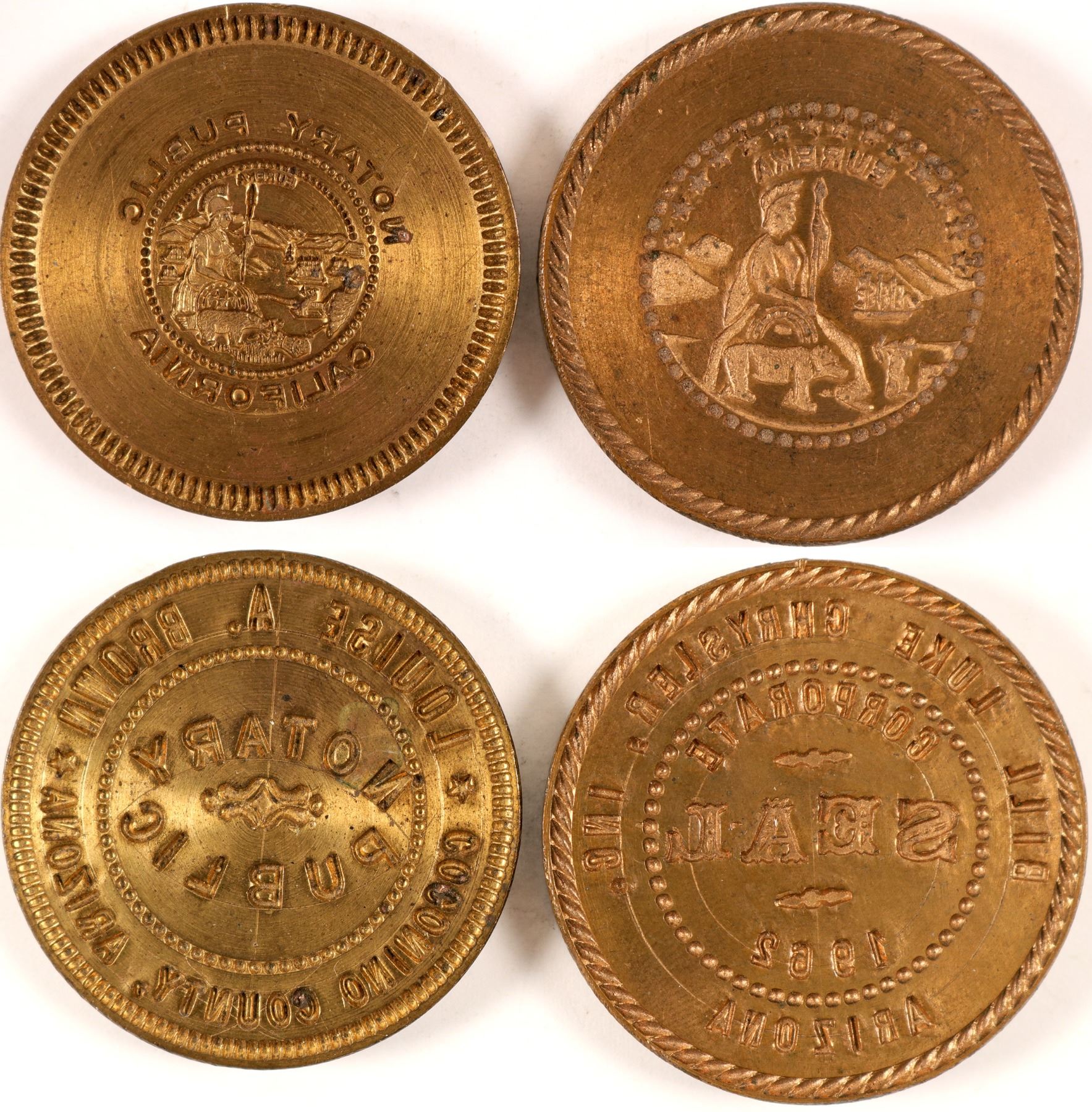 Lot of two brass medallions. 1) Louise A. Brown / Notary / Public / Cococino County Arizona. Rev.: Notary Public / California. 42 mm. 2) Bill Luke Chrysler, Inc. / Corporate / Seal / 1962 /Arizona. Rev.: Eureka. 44 mm.