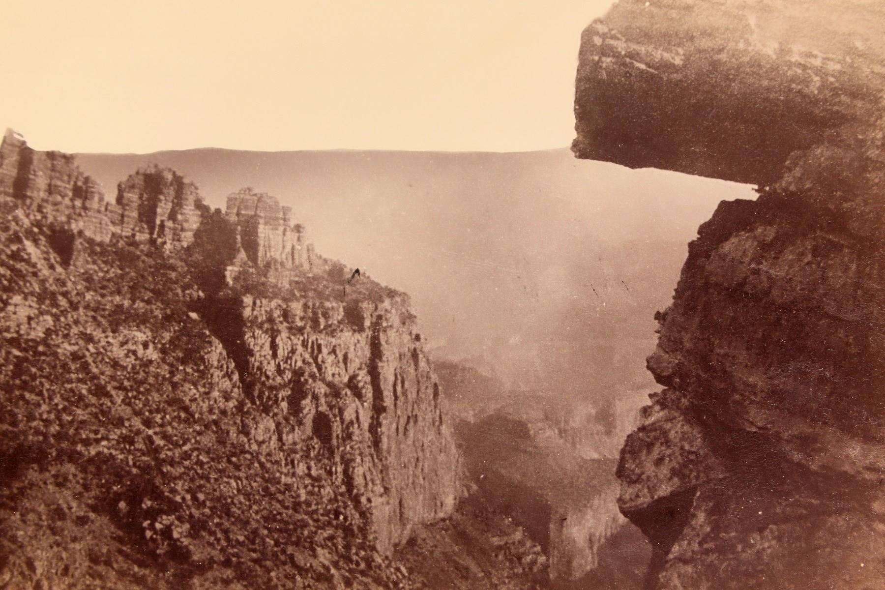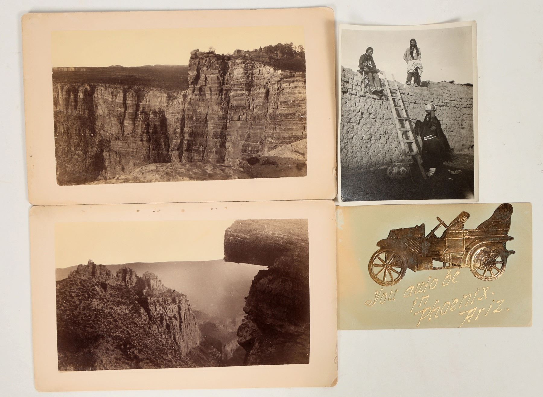 Lot of 4. 1 and 2) Two different cabinet cards of the Grand Canyon by Erwin Baer, Photographer in Prescott. c.late 1880s-1890s. These are not your typical Grand Canyon views. One has a few scuffs and a small tear. Baer was later a partner with Haynes of Yellowstone fame. 3) 5 x 3.75" of three Native Americans with pottery visible. Back has pencil notations that these are Pueblo Native Americans in Arizona. No photographer or date. Creased corner. 4) Early postcard featuring raised gilt image of an early automobile and text "You auto be in Phoenix, Ariz." Not mailed. United Art Publishing Co.